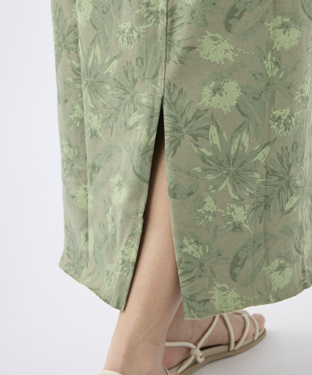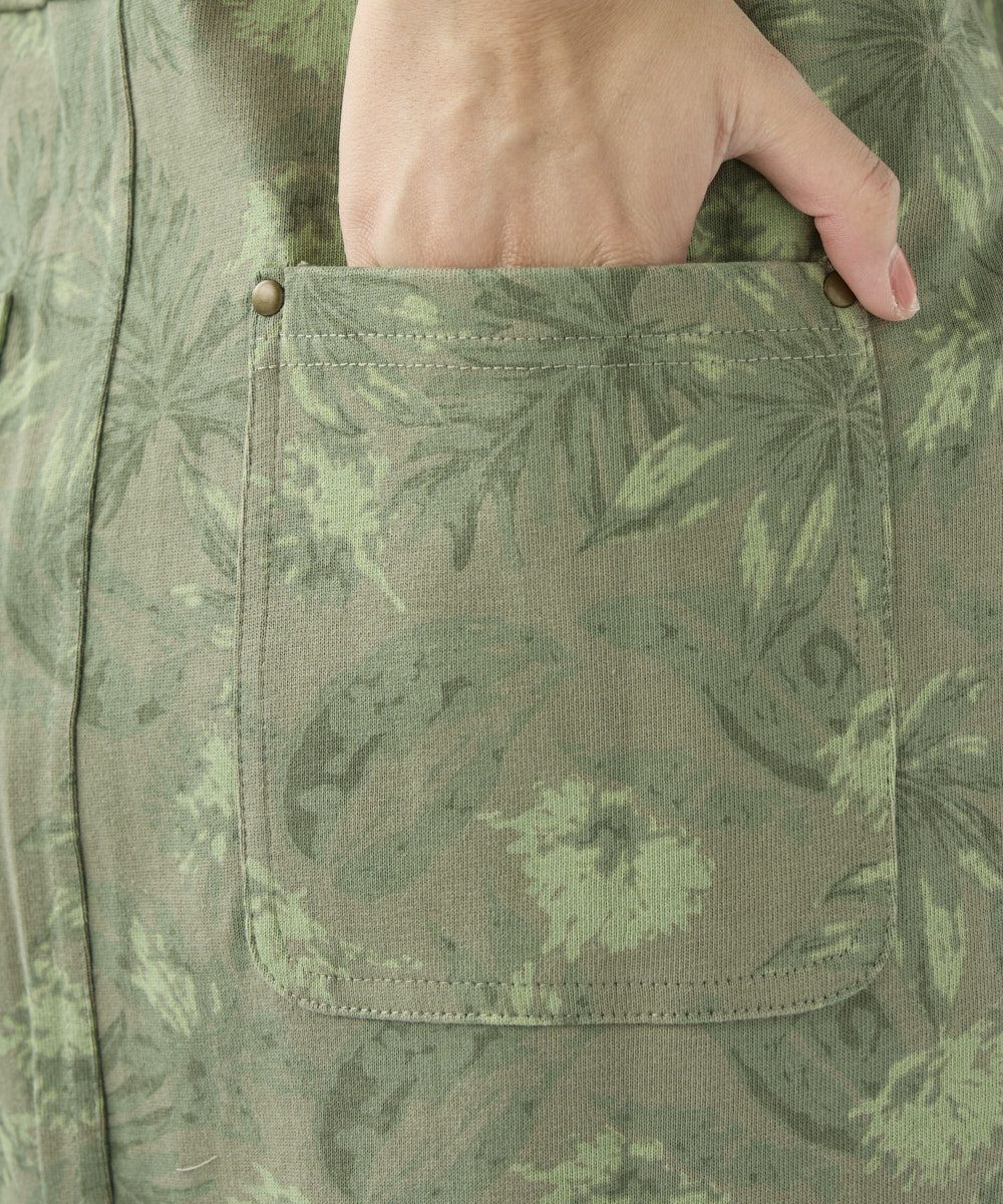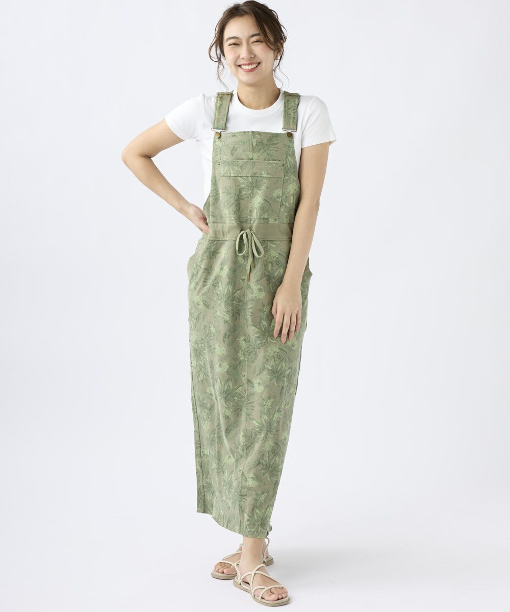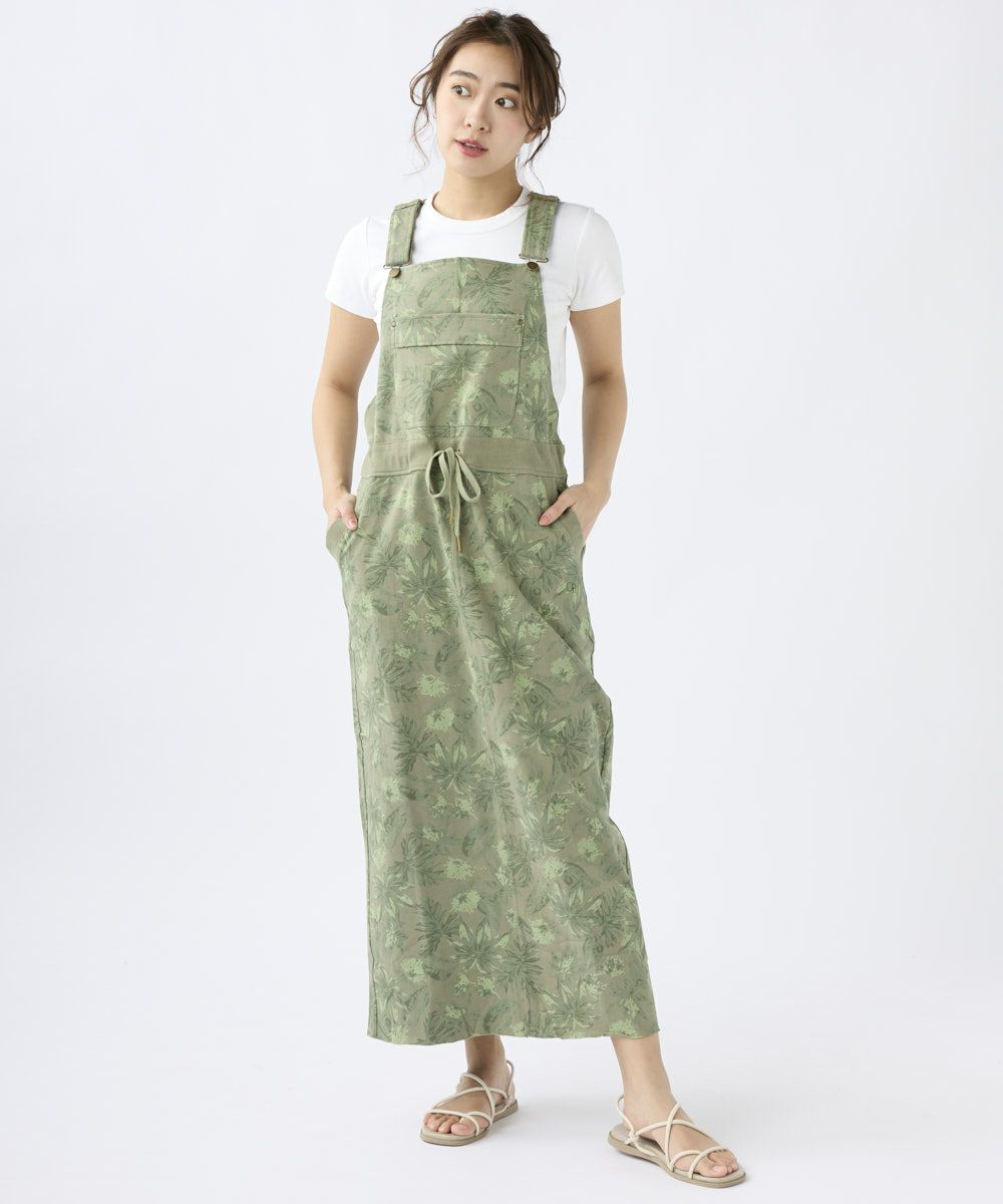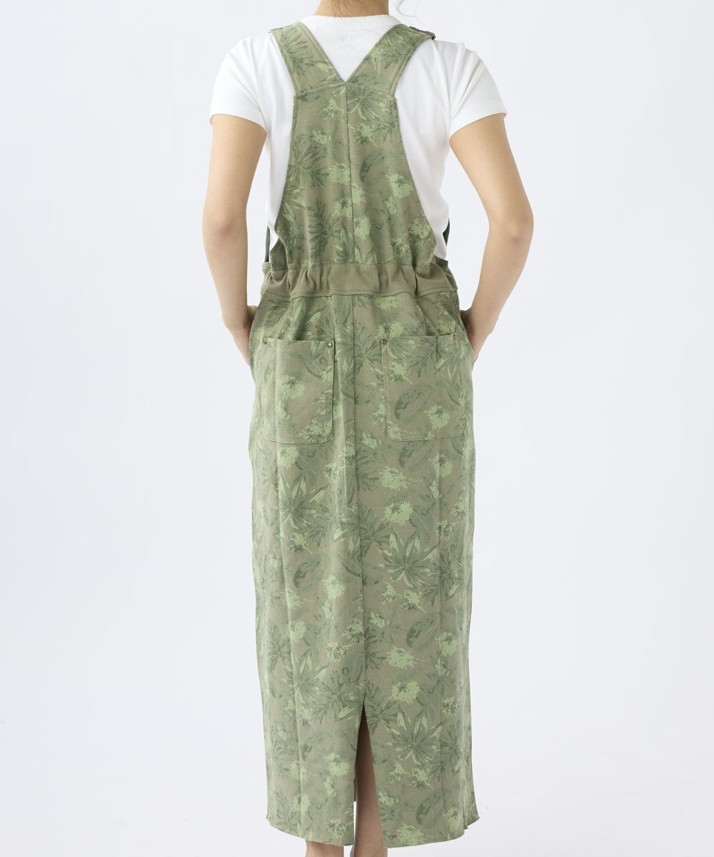 ボタニカル柄のジャンパースカート。ワンマイルにもぴったり。ウエストが調整できるので、妊婦の方にもおすすめ。