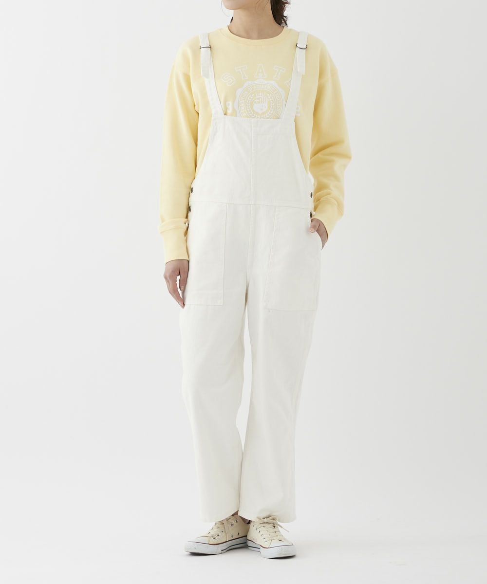 ライトデニムのオーバーオール。軽めの素材感とあえて長めの肩紐部分がデザインポイント。