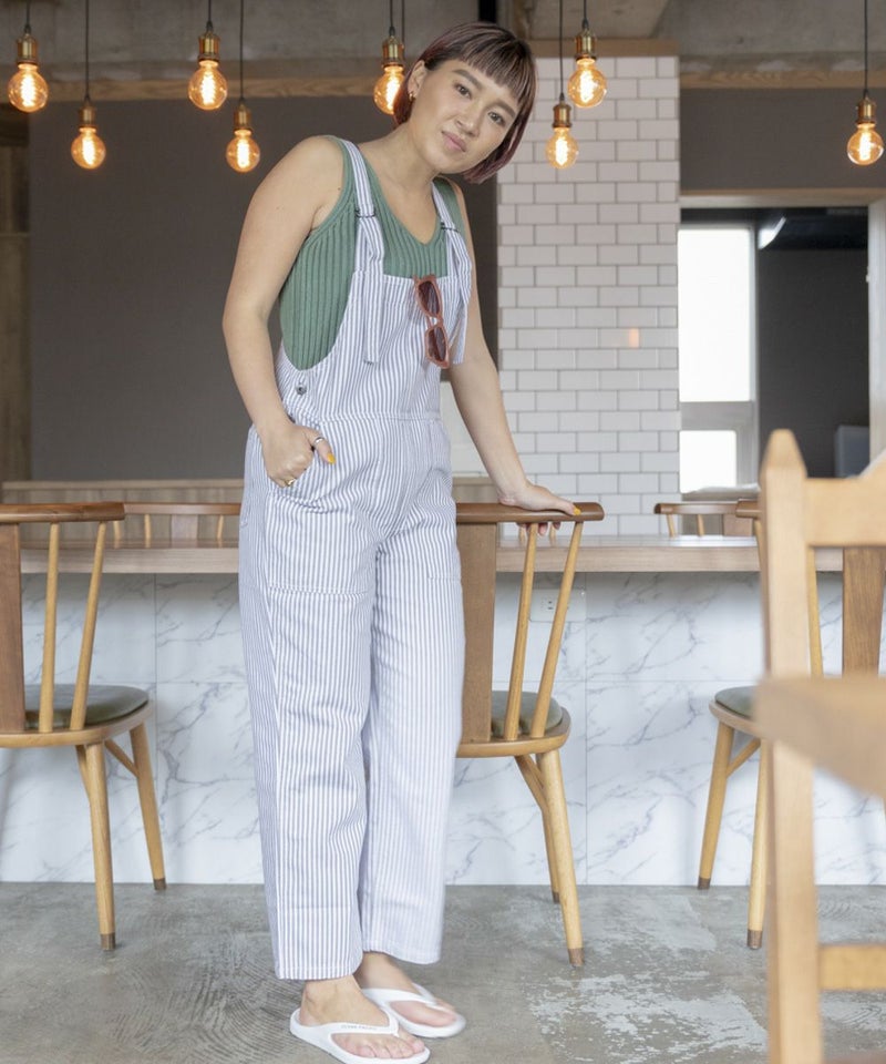 きれいなカラーのストライプ生地を使ったサロペット。軽めの素材で春夏でも涼しく着用可能。軽めの素材感とあえて長めの肩紐部分がデザインポイント。