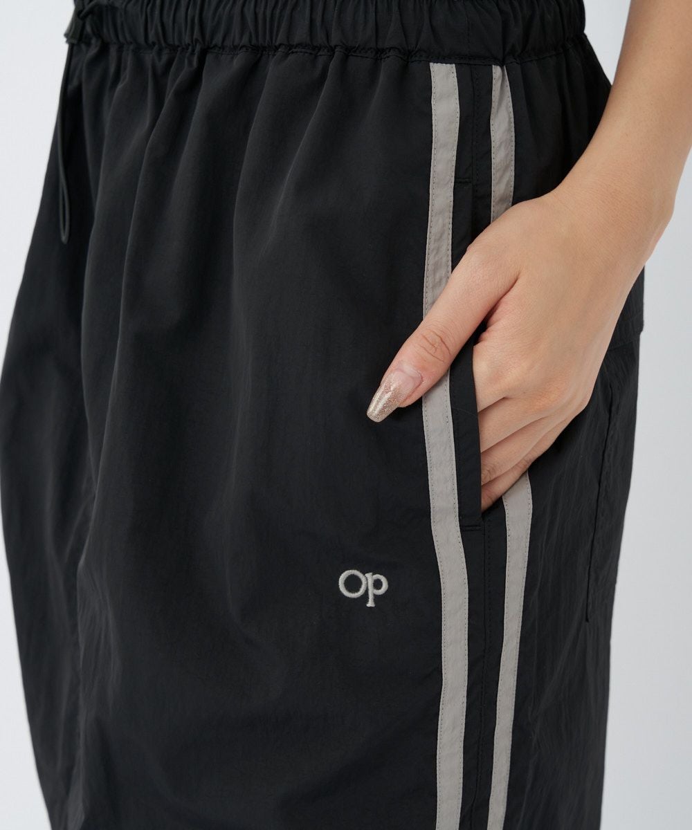 配色のラインとOPの刺繍ロゴがポイントのナイロンスカート。