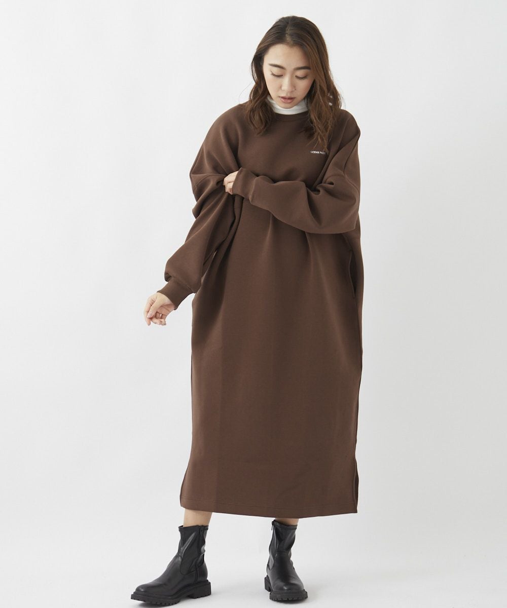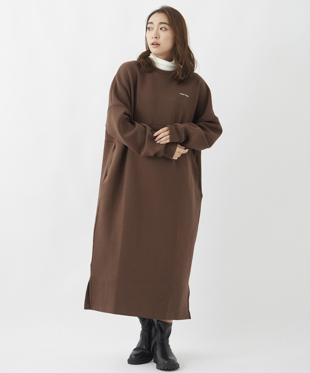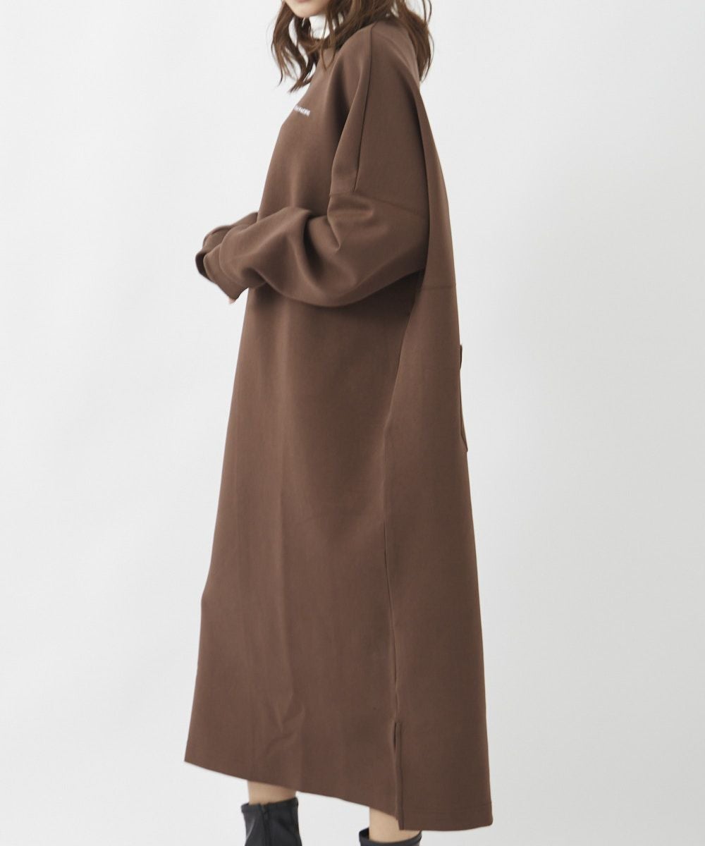 身体のラインを拾うことなくざっくりとスタイリングできる、スウェット素材のロングワンピース。胸元にあしらった小さなロゴが、ちょっとした着こなしのアクセントに。サイドにはポケット付きで、実用性も◎。