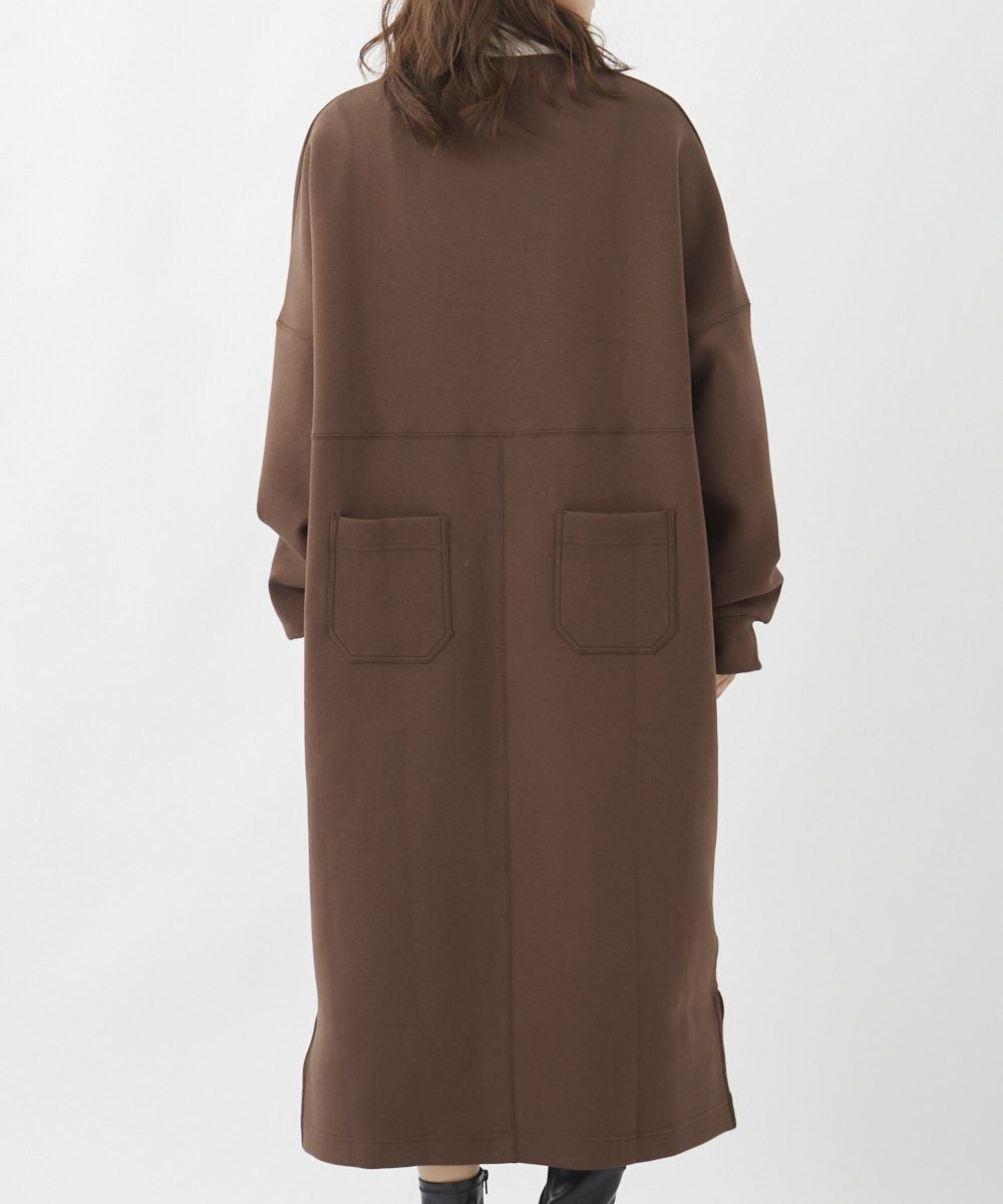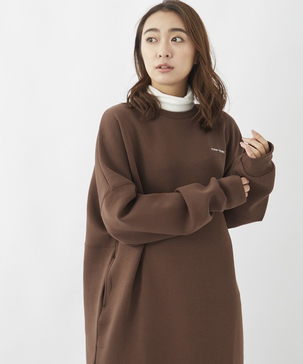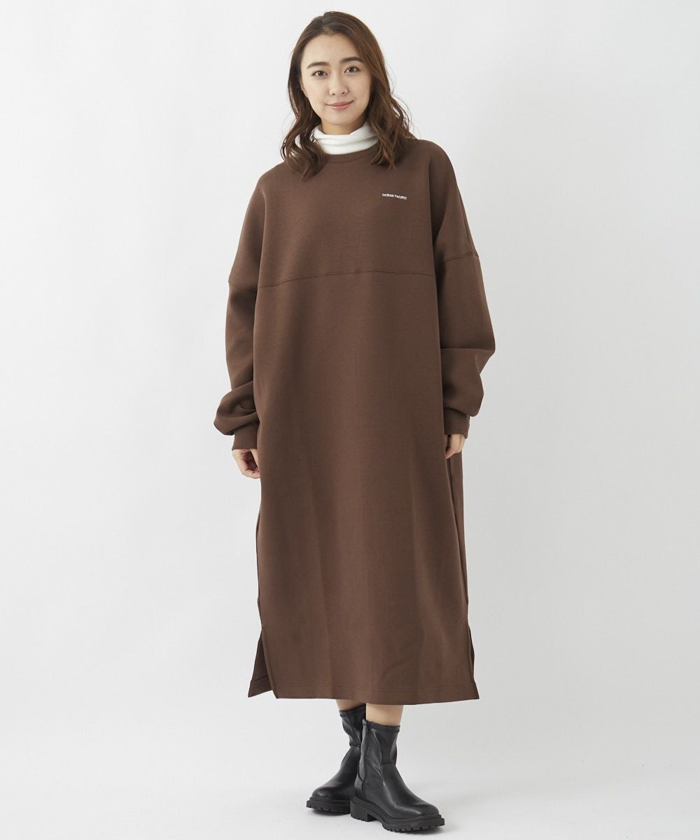 身体のラインを拾うことなくざっくりとスタイリングできる、スウェット素材のロングワンピース。胸元にあしらった小さなロゴが、ちょっとした着こなしのアクセントに。サイドにはポケット付きで、実用性も◎。