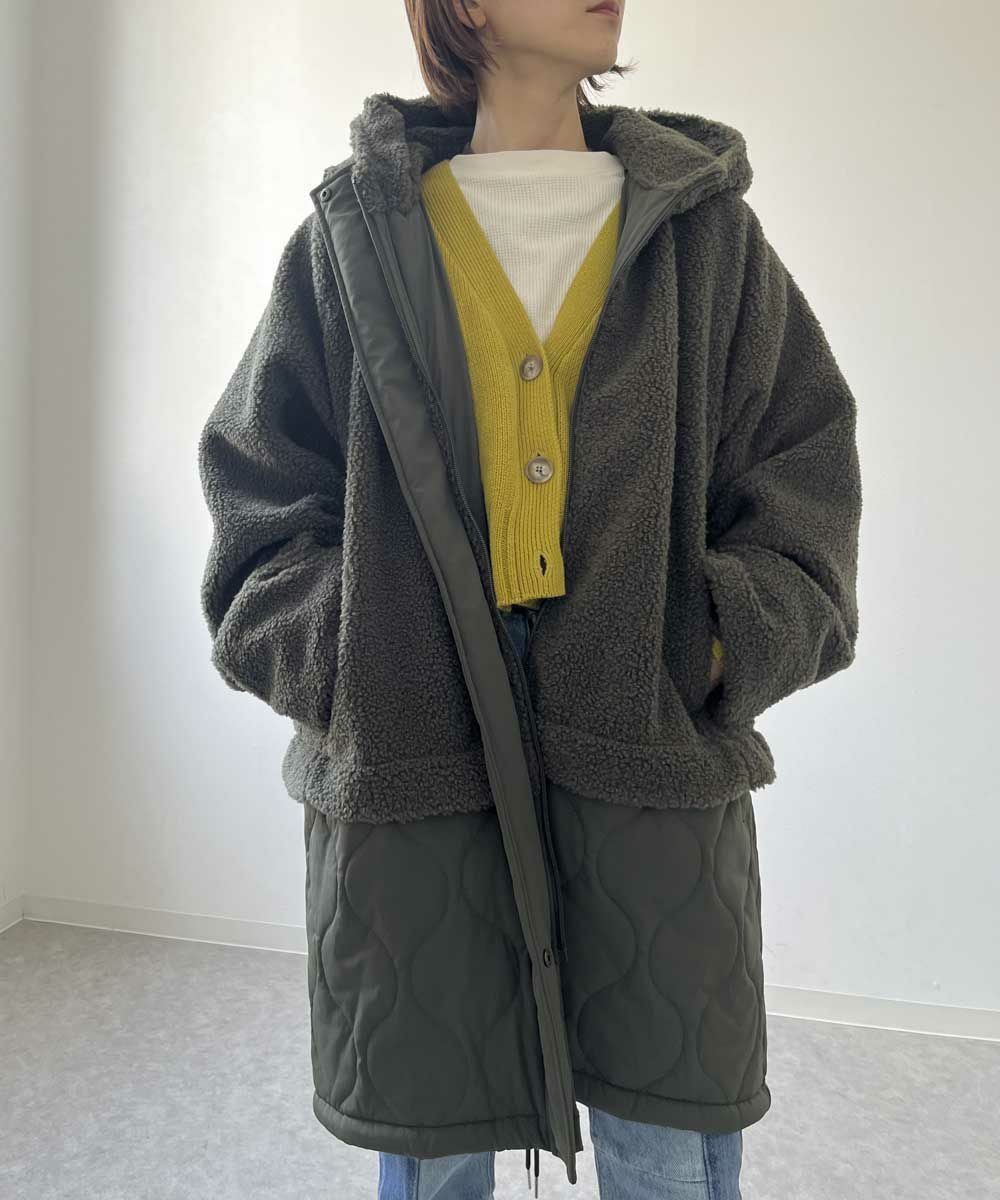 マットな品のある質感のキルティング素材と、ふわふわのボア素材を切り替えでスッキリ見せてくれる、ドッキングボアキルトコート!