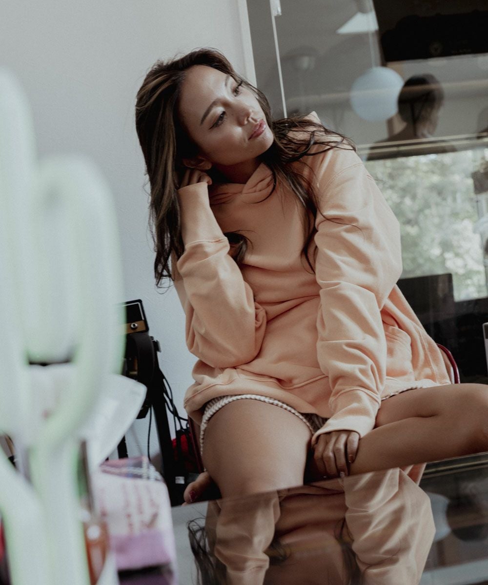 ・シンプルなスウェットパーカーにピグメント加工を加えた1着