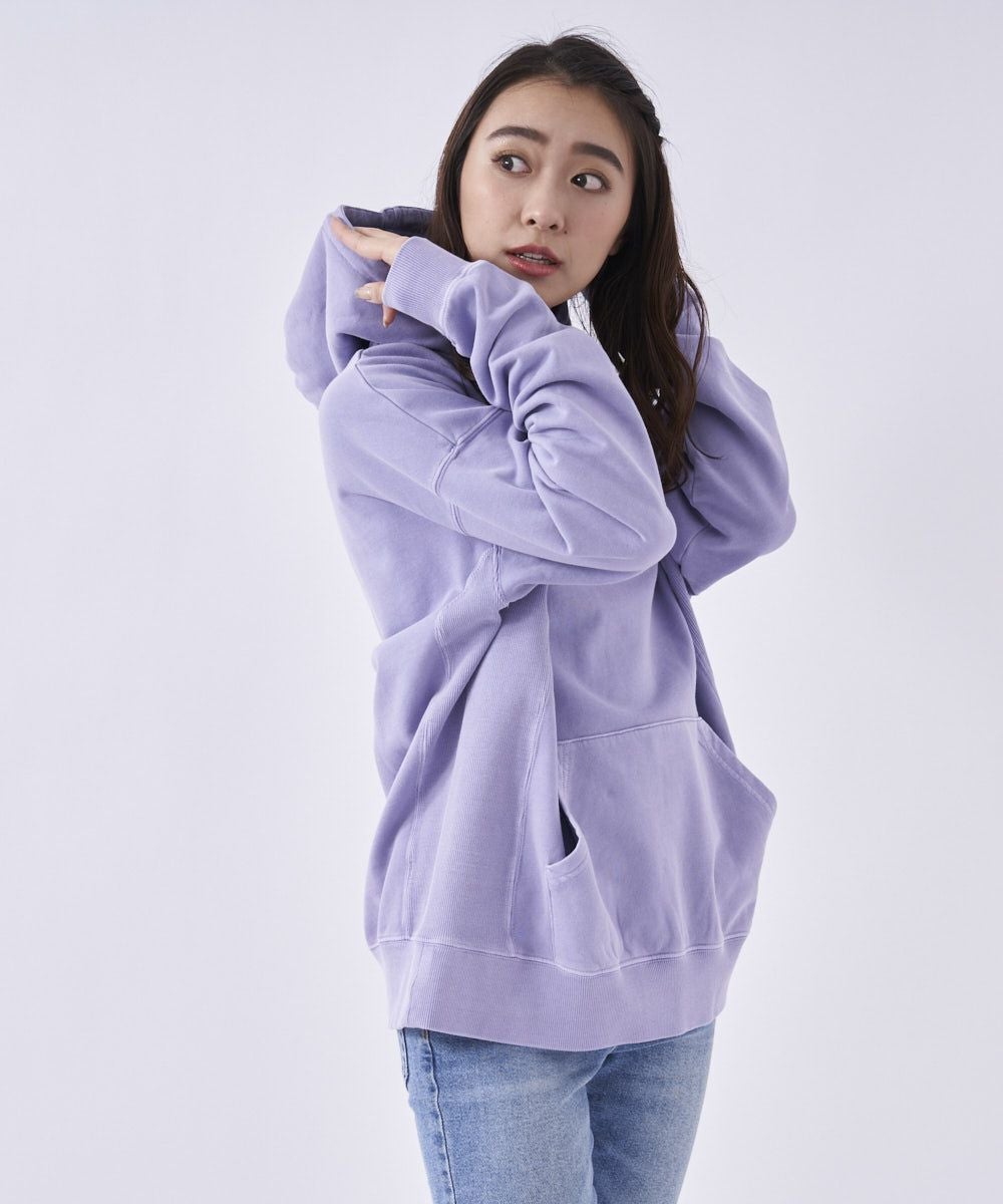 ・シンプルなスウェットパーカーにピグメント加工を加えた1着