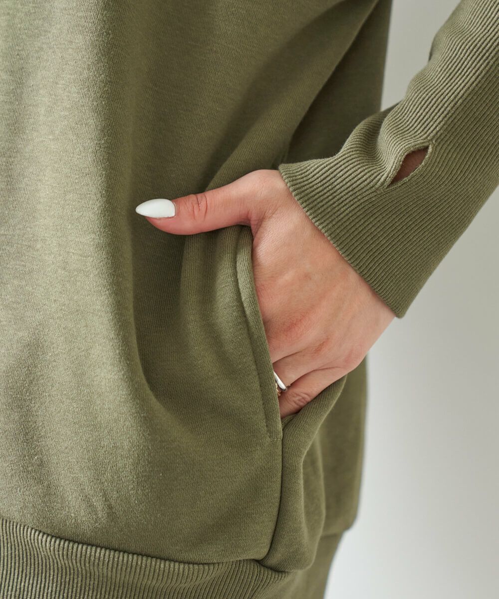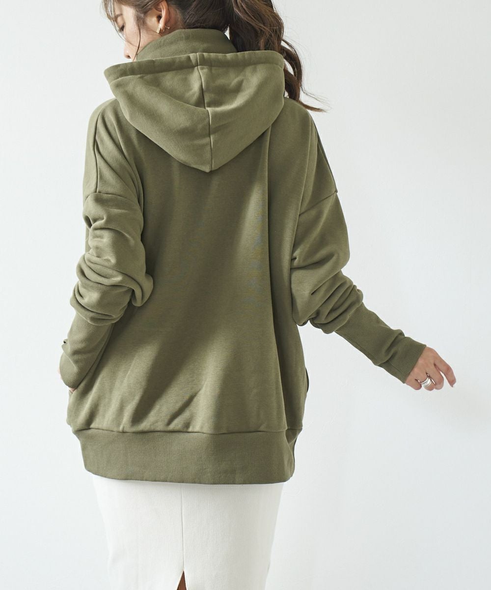 ネックウォーマー付裏毛パーカープルオーバー。しっかりリブがシルエットをより可愛く見せます。