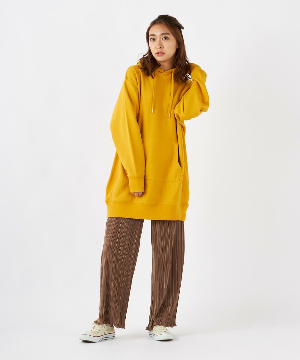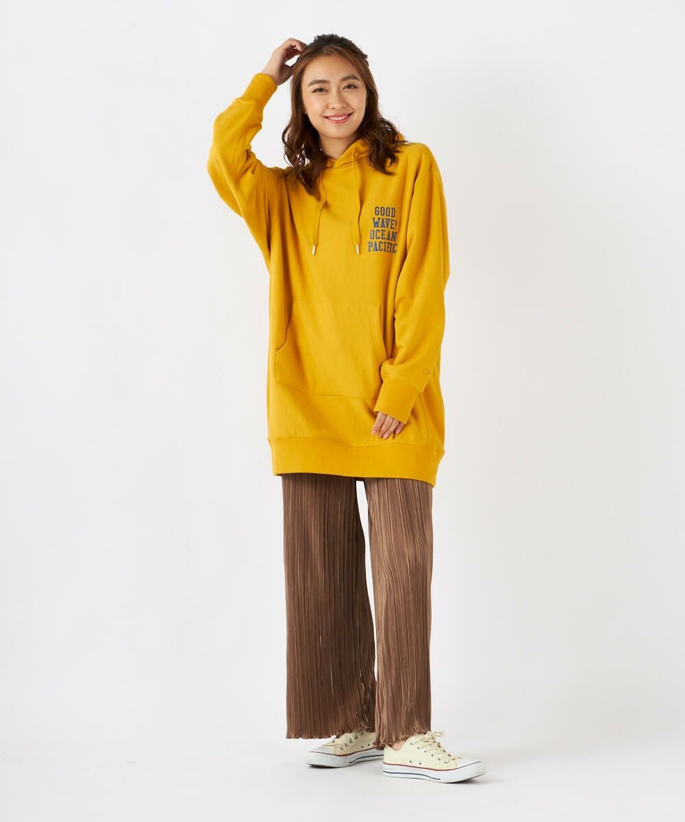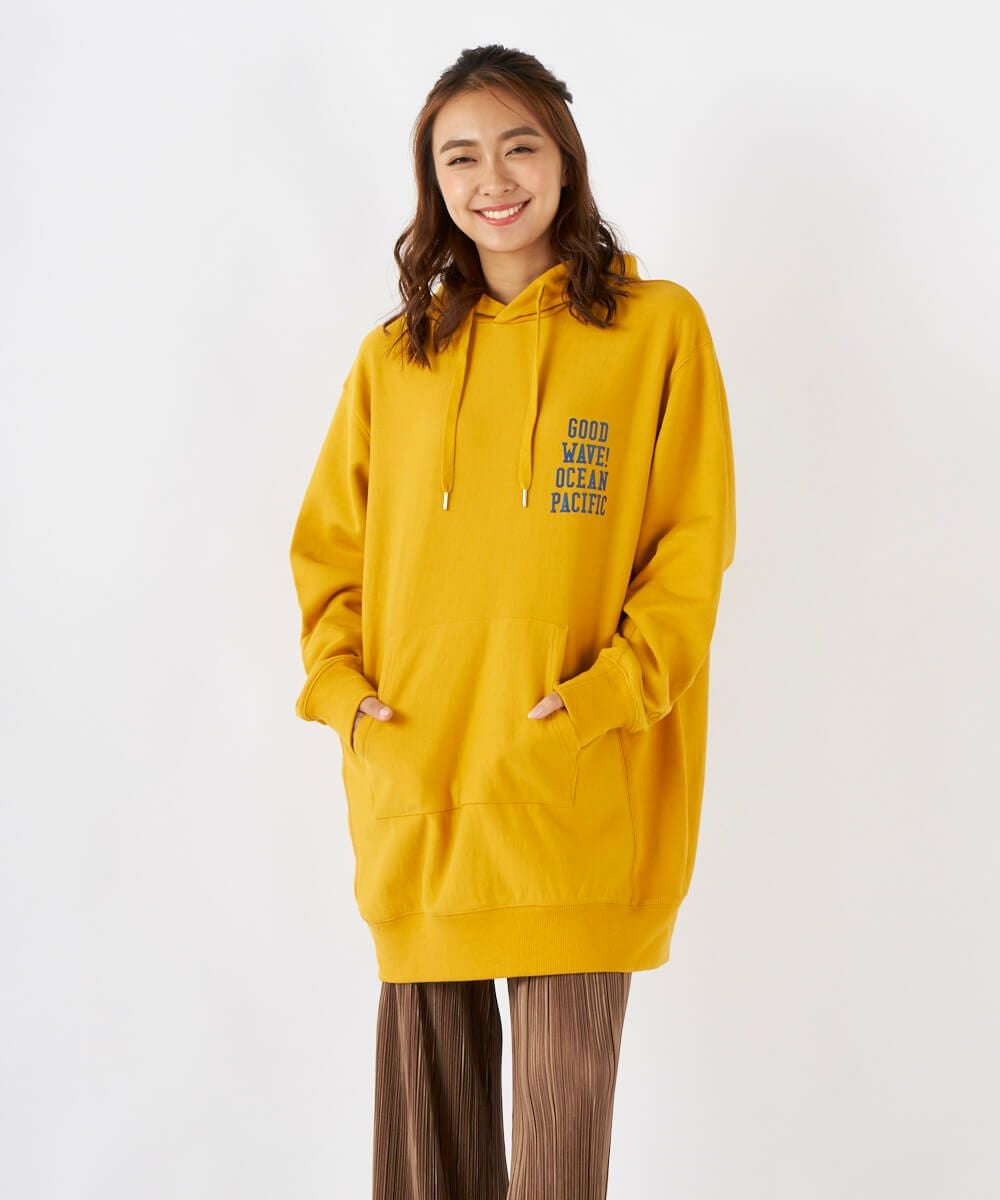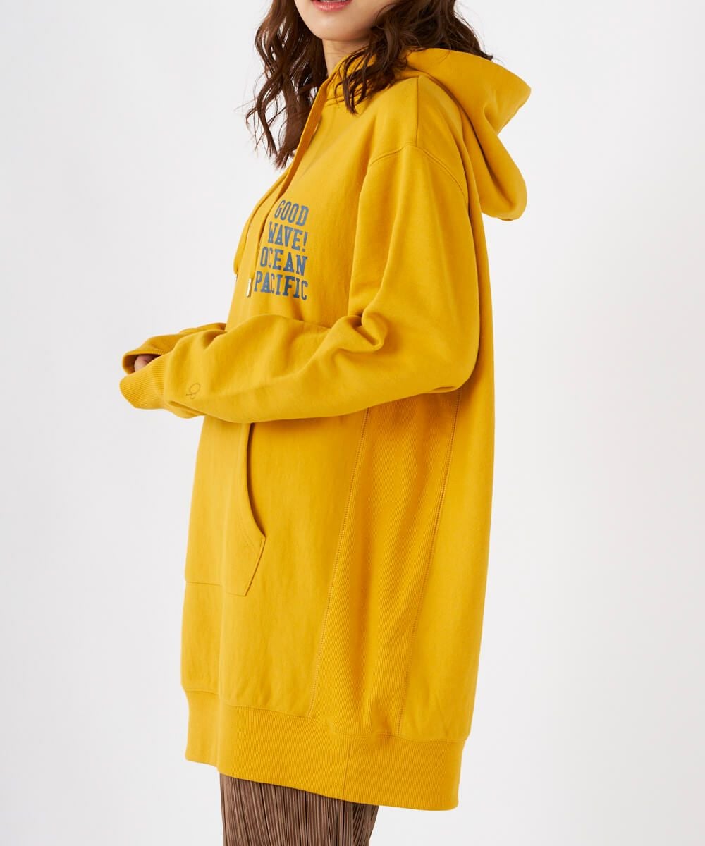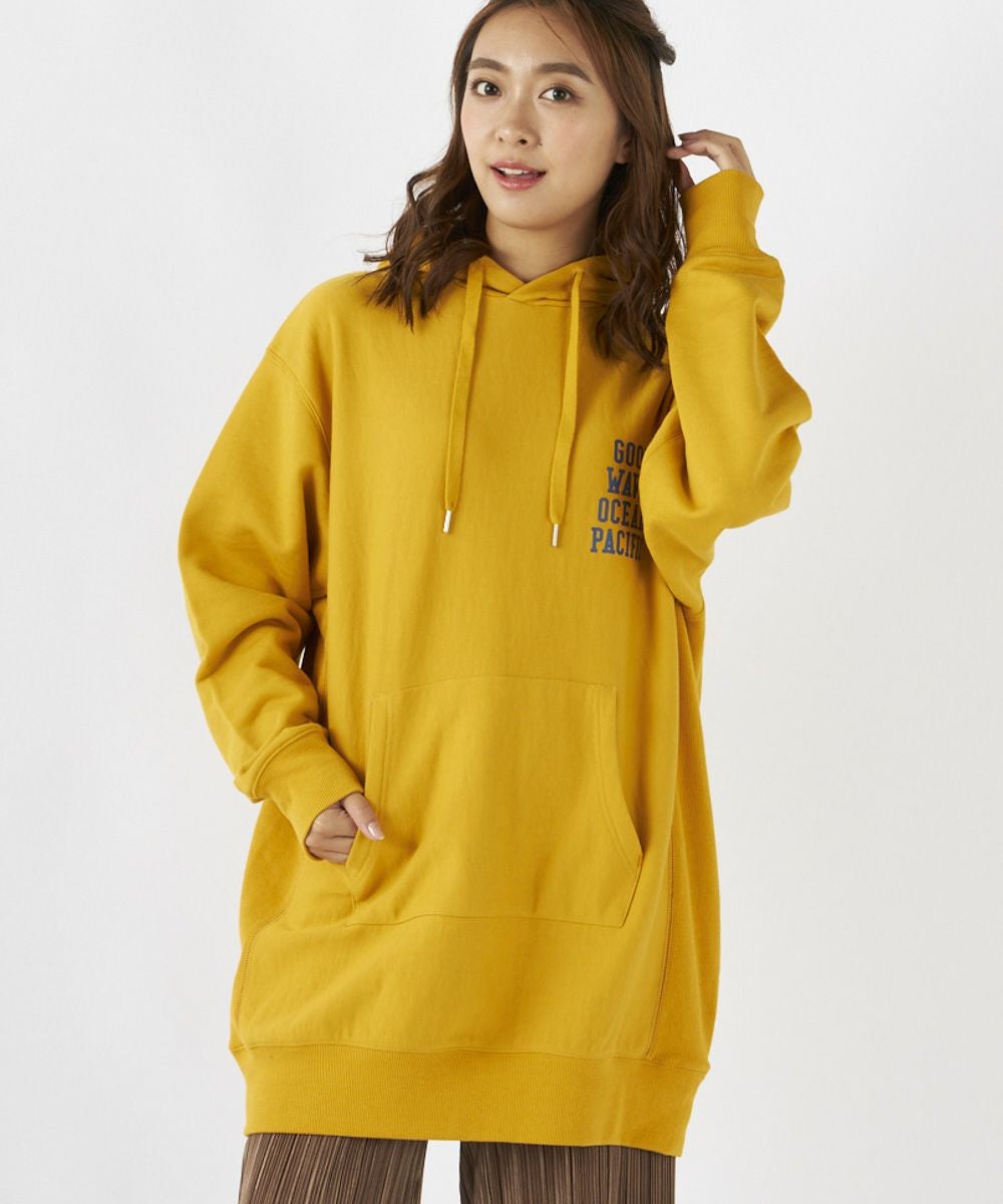 左胸のロゴプリントがアクセントになったチュニック丈のパーカーです。裏毛仕様なので、あたたかく秋冬にぴったり。サイドの切り替えがおしゃれな1枚です。
