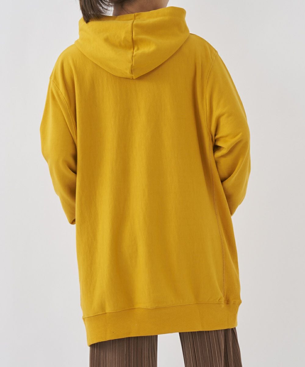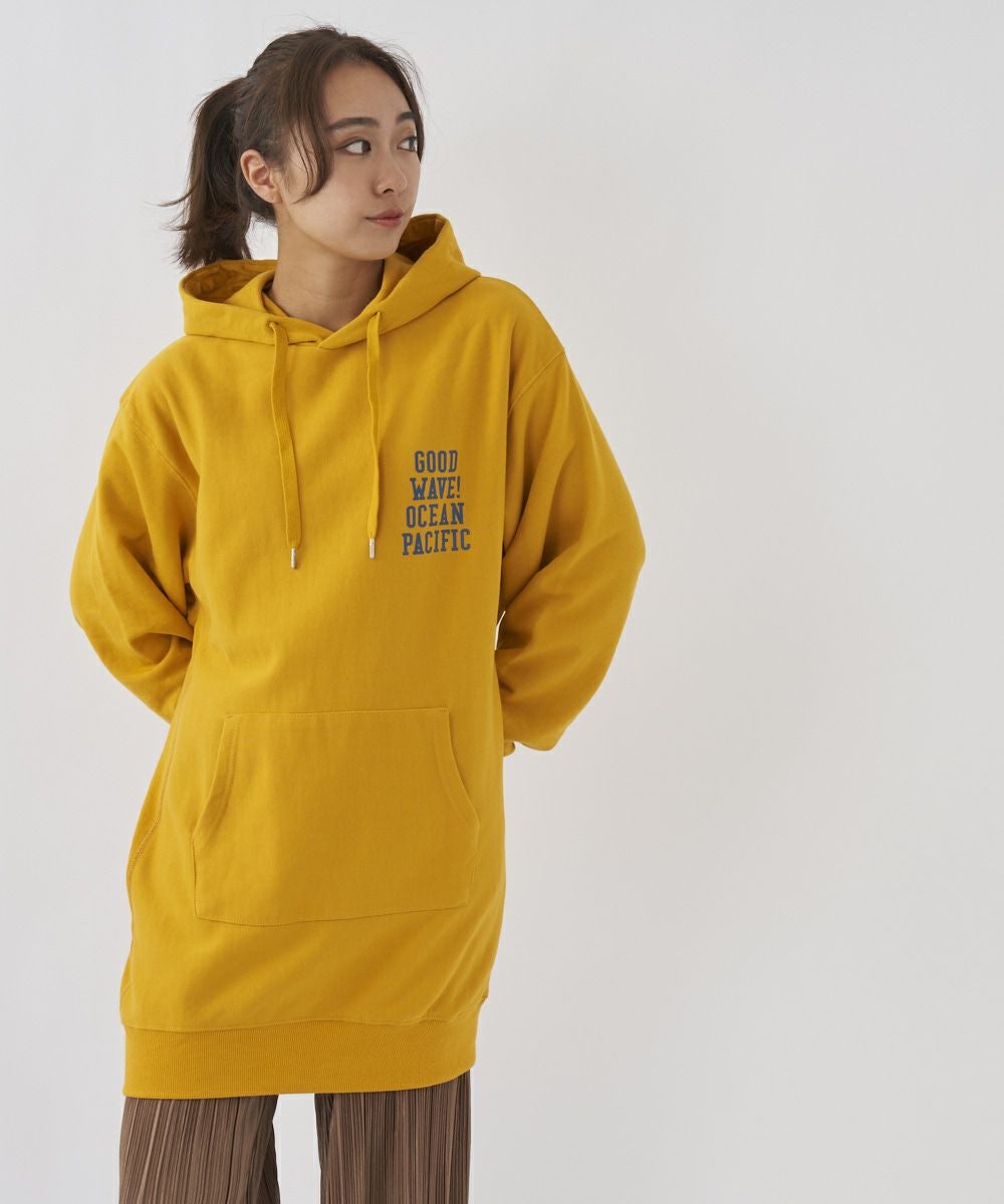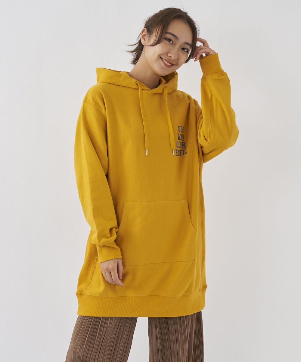 左胸のロゴプリントがアクセントになったチュニック丈のパーカーです。裏毛仕様なので、あたたかく秋冬にぴったり。