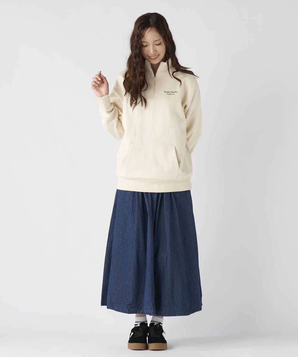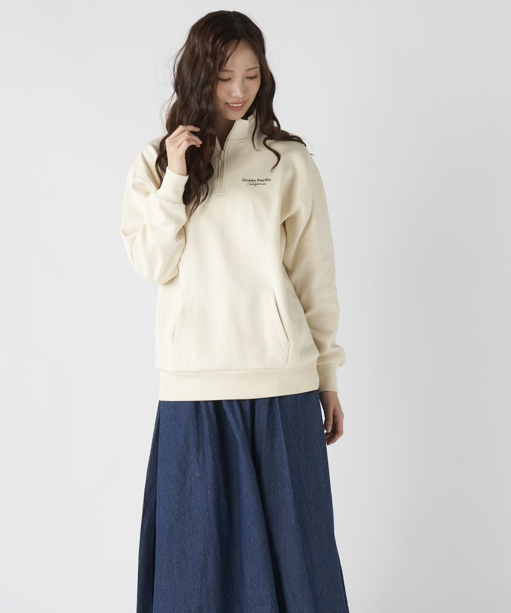 柔らかくふんわり裏起毛で保温性◎軽量でもしっかり暖かく、ゆったりシルエットでストレスフリーな着心地。トレンド感と快適さを両立した、秋冬に大活躍間違いなしのアイテムとなっています。胸元のブランドロゴと、背中に大胆に施された英文メッセージが目を引くスウェット。カジュアルストリートなイメージで、ハーフジップ仕様なので、気温やスタイリングに合わせて襟元の表情を変えられるのが魅力です。