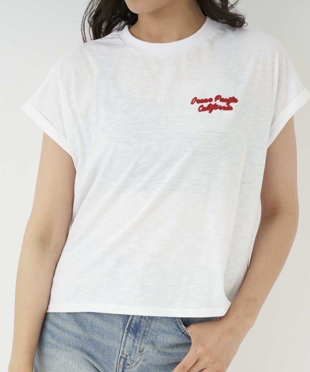 涼しげな表面感のあるスラブ天竺。フロントとバックと共にチェーン刺繍でさらっとオシャレに。