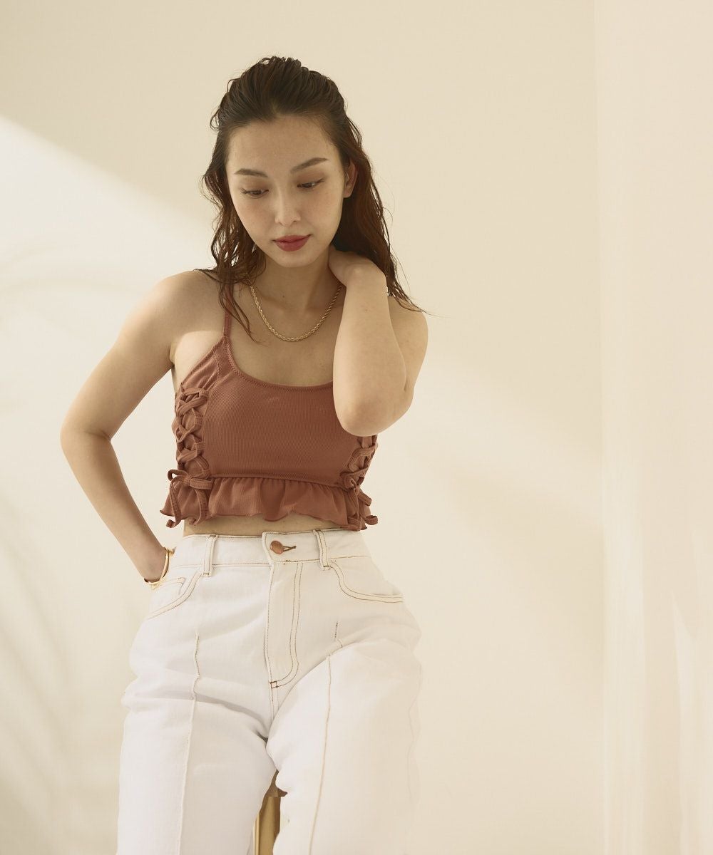 フリルが特徴のビキニなので、ローライズデニムとの相性がかわいいです◎