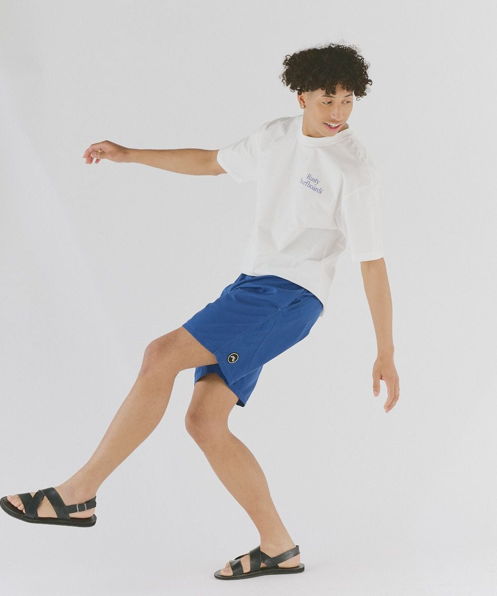 メンズボードショーツ。シンプルで無地のデザインに、RUSTYのシンボル『R.』のワッペンがアクセント。