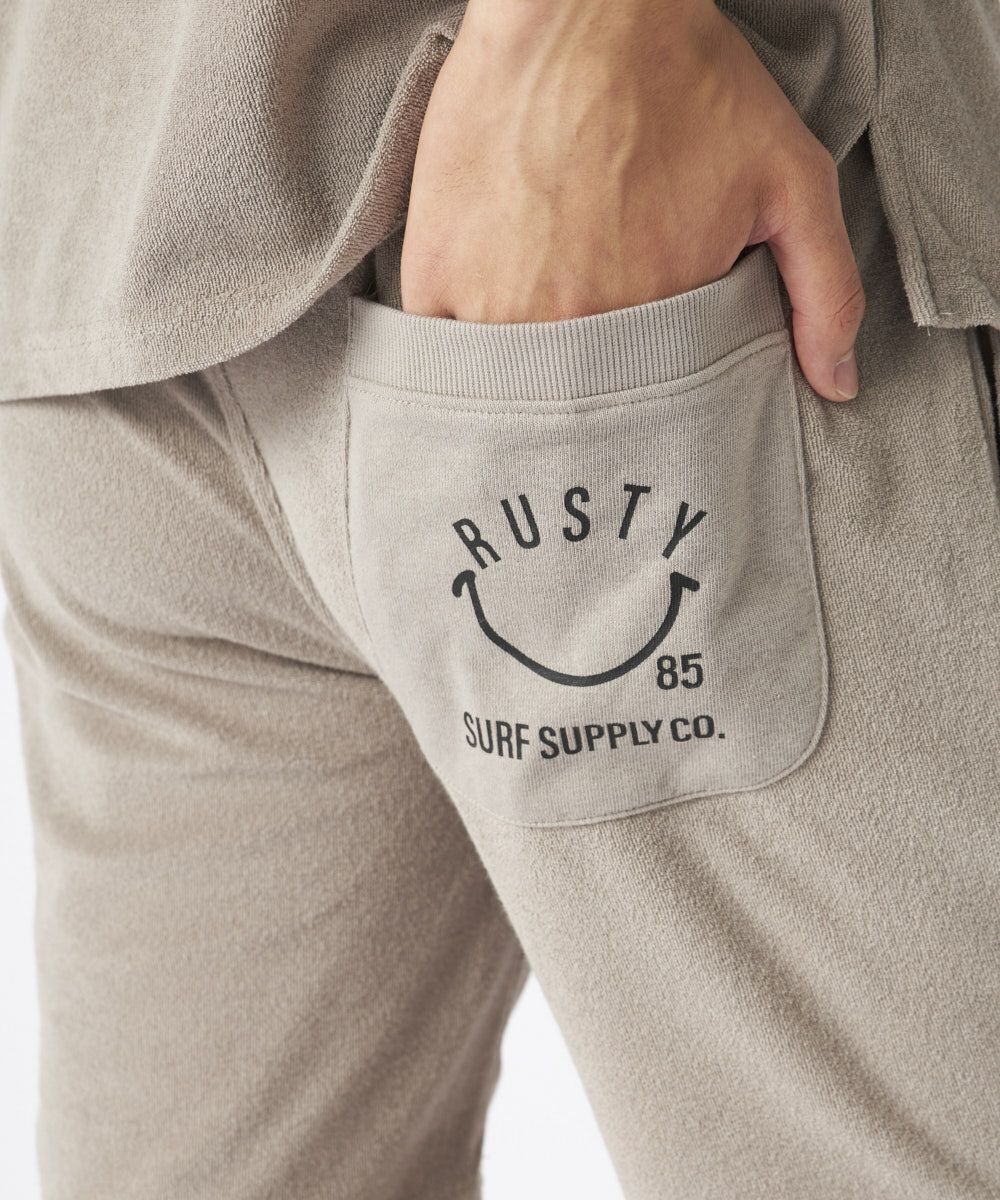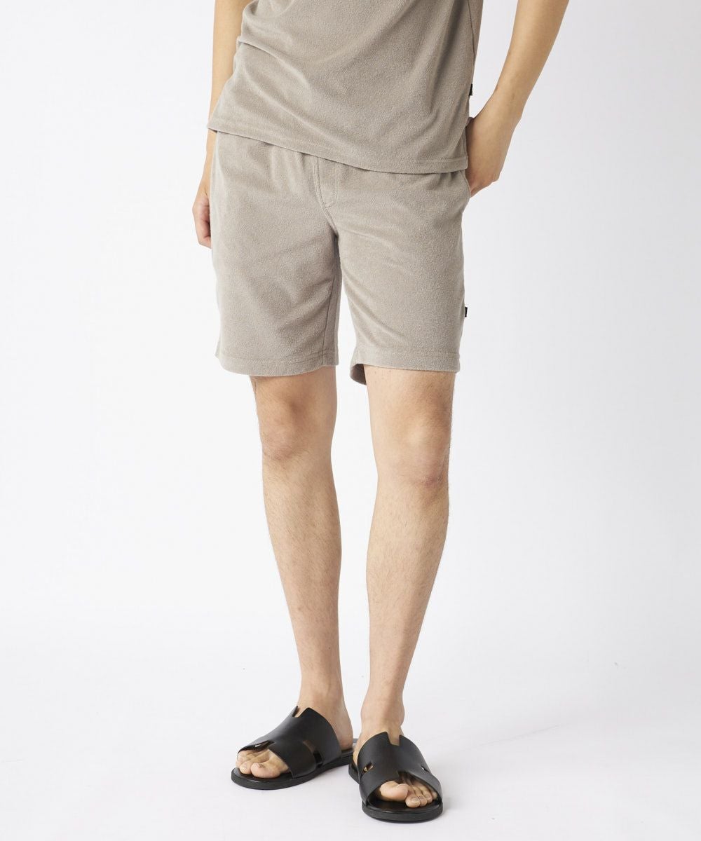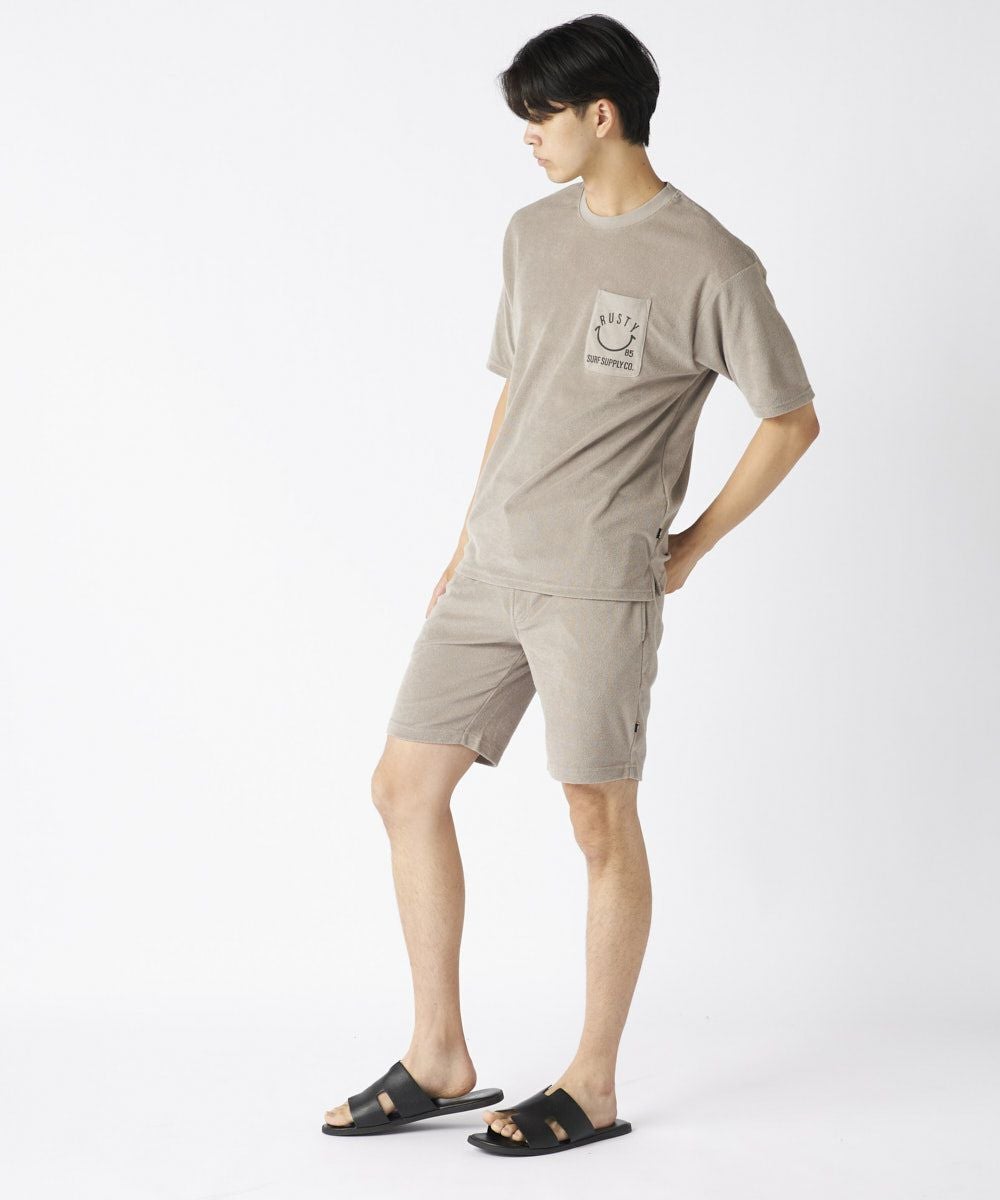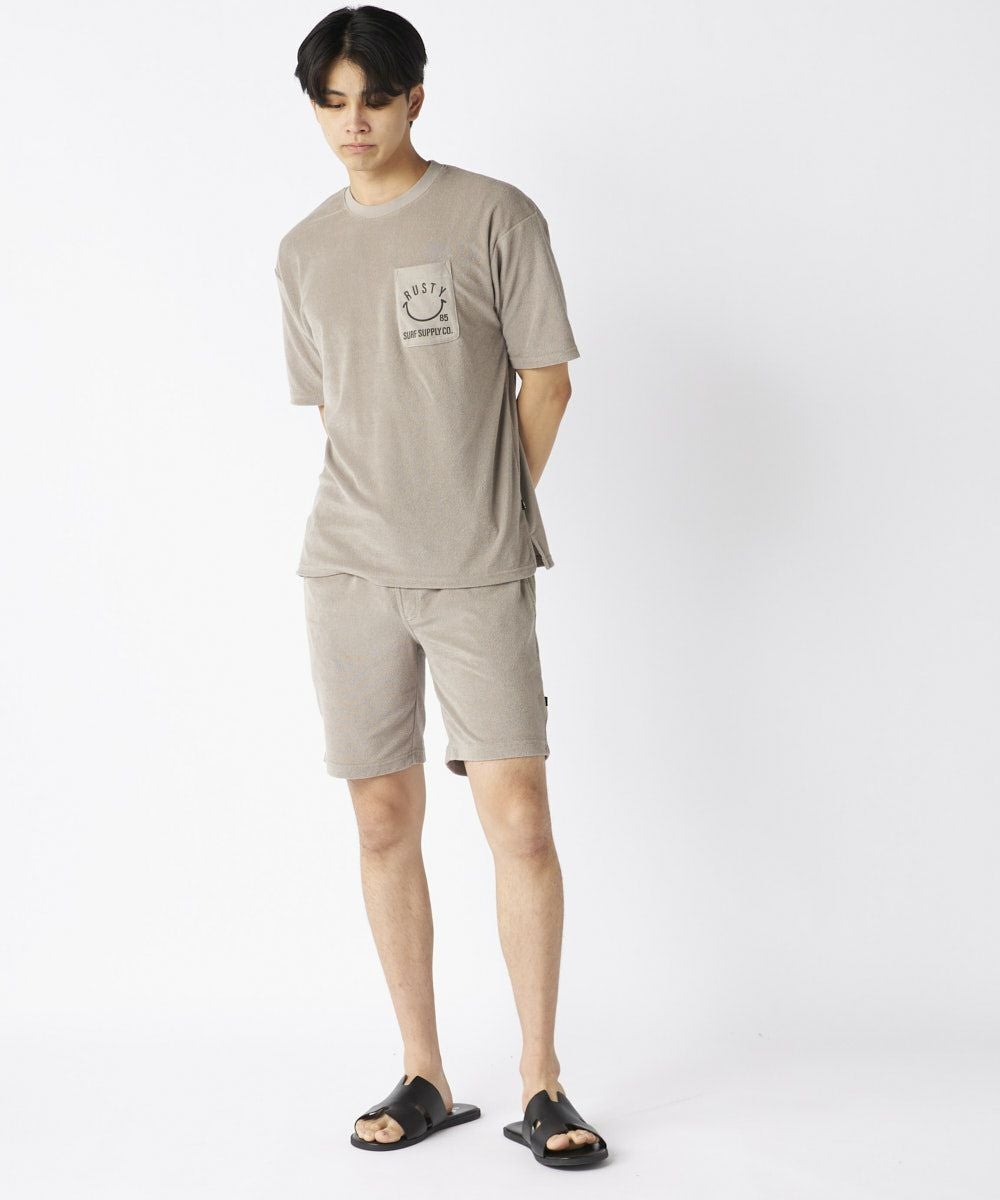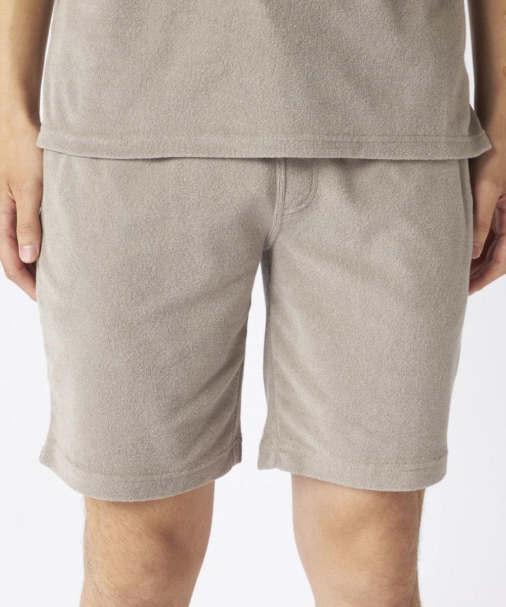 メンズショートパンツ。パイル素材で柔らかく快適な履き心地。 定番のニコちゃんグラフィックをあしらったデザインで、カジュアルでリラックスしたスタイルを楽しめます