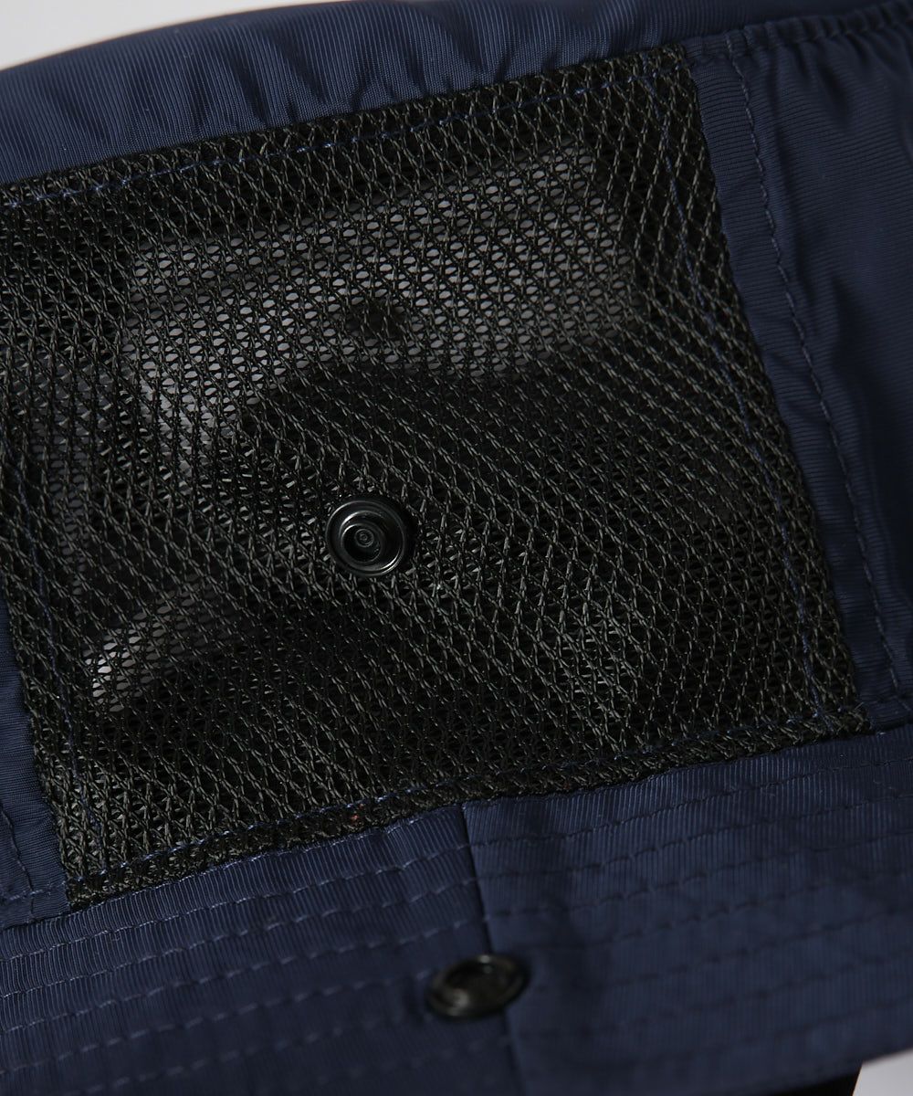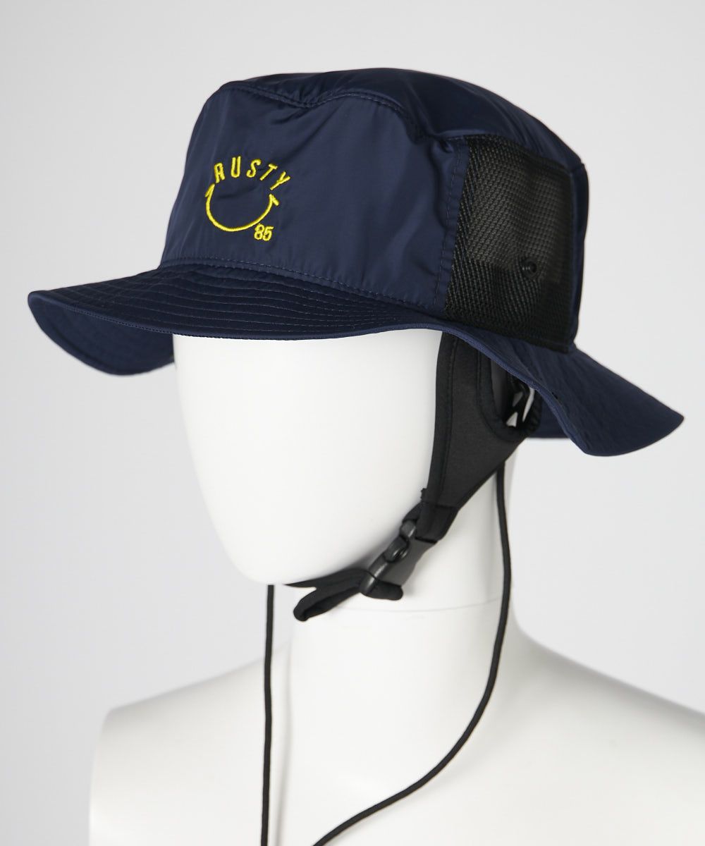 サイドはメッシュ切り替えで通気性バツグン!取り外し可能なあご紐付きで、風が強い日でもしっかりフィットします。フロントに刺繍された「RUSTY」のロゴとニコちゃんがさりげないアクセントに♪