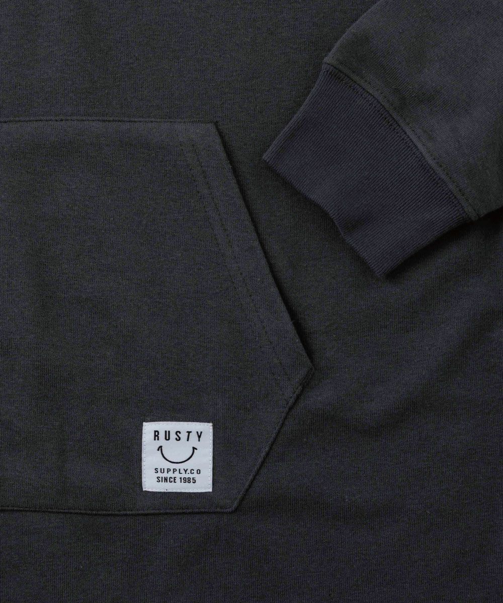 素材はしっかりとした生地感のある裏毛。シルエットはワンピース型デザインで、カンガルーポケットも配置しています。バックにはオーストラリアの有名なサーフポイント名をプリント。
