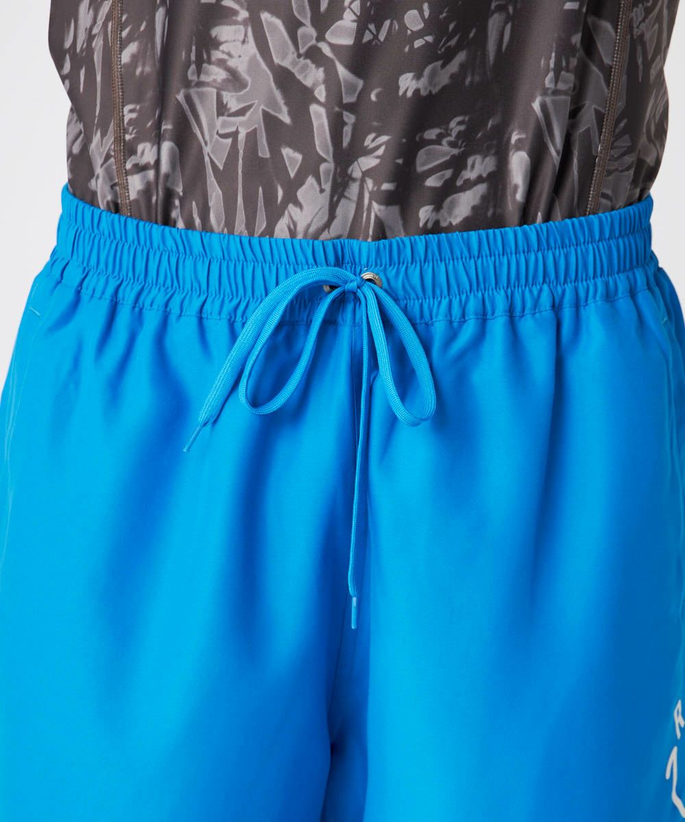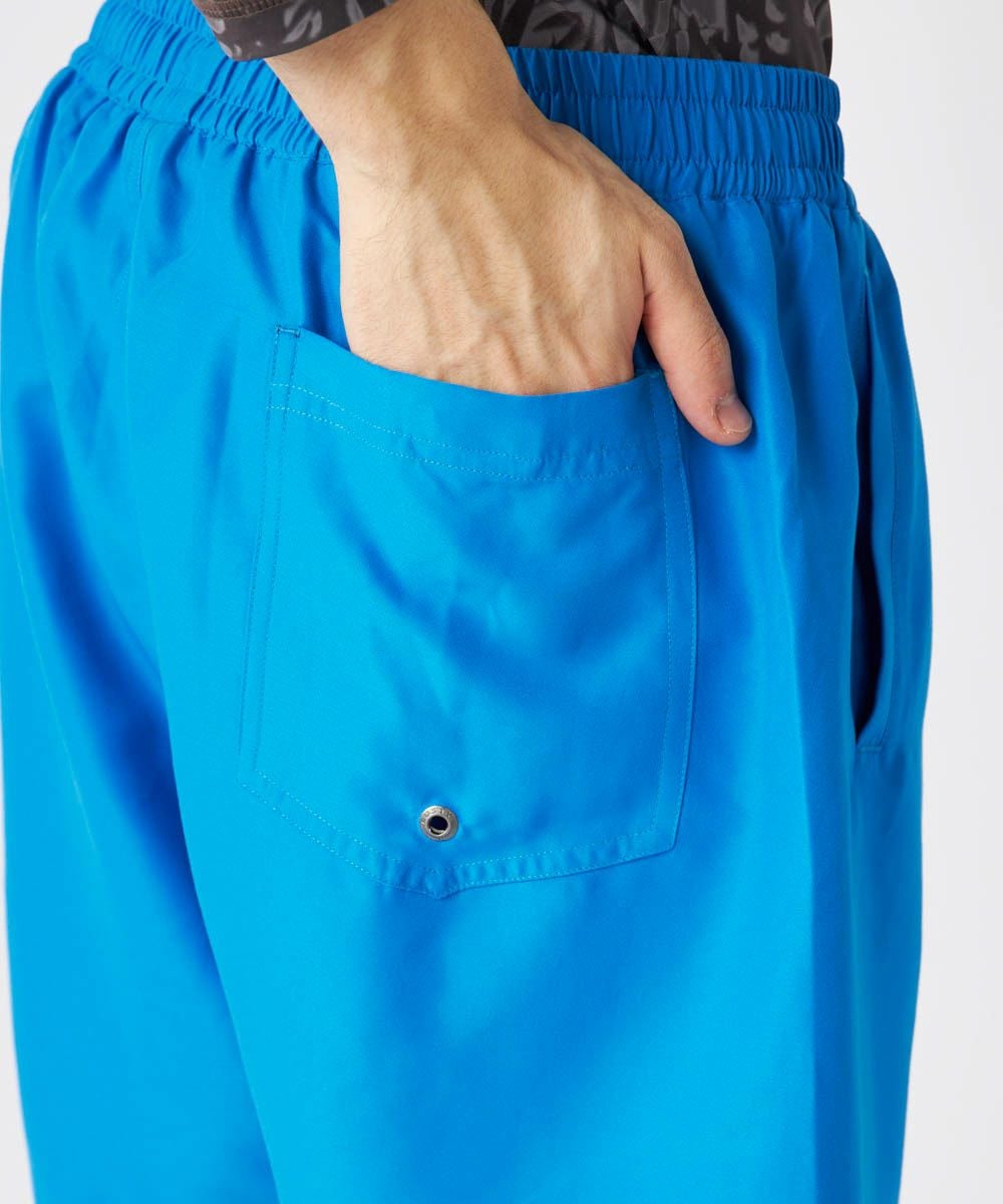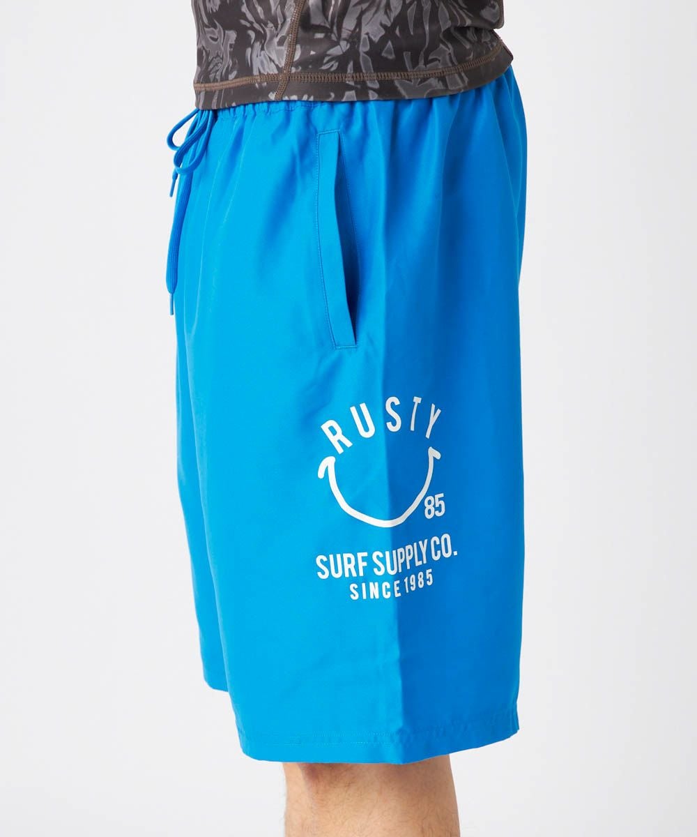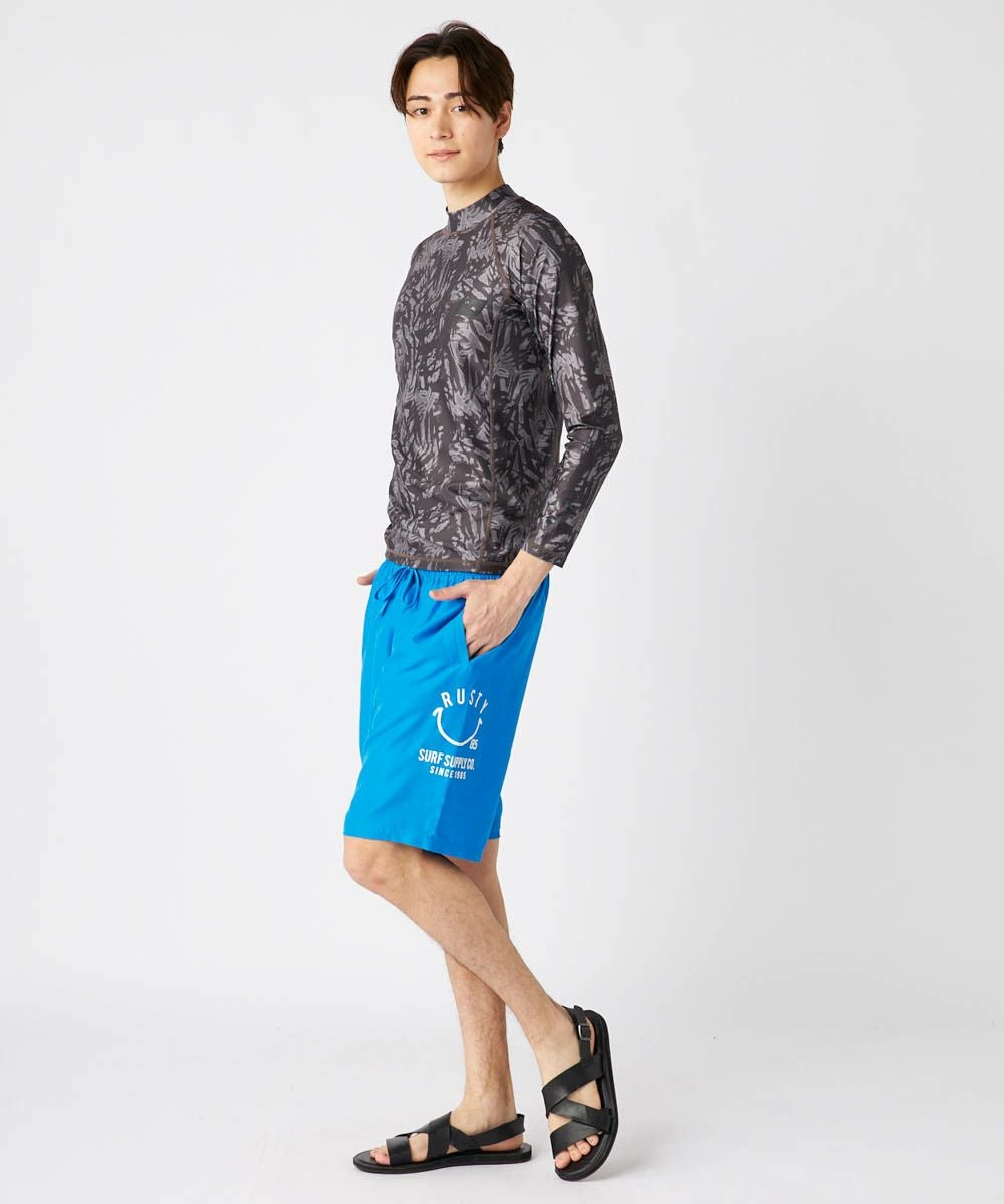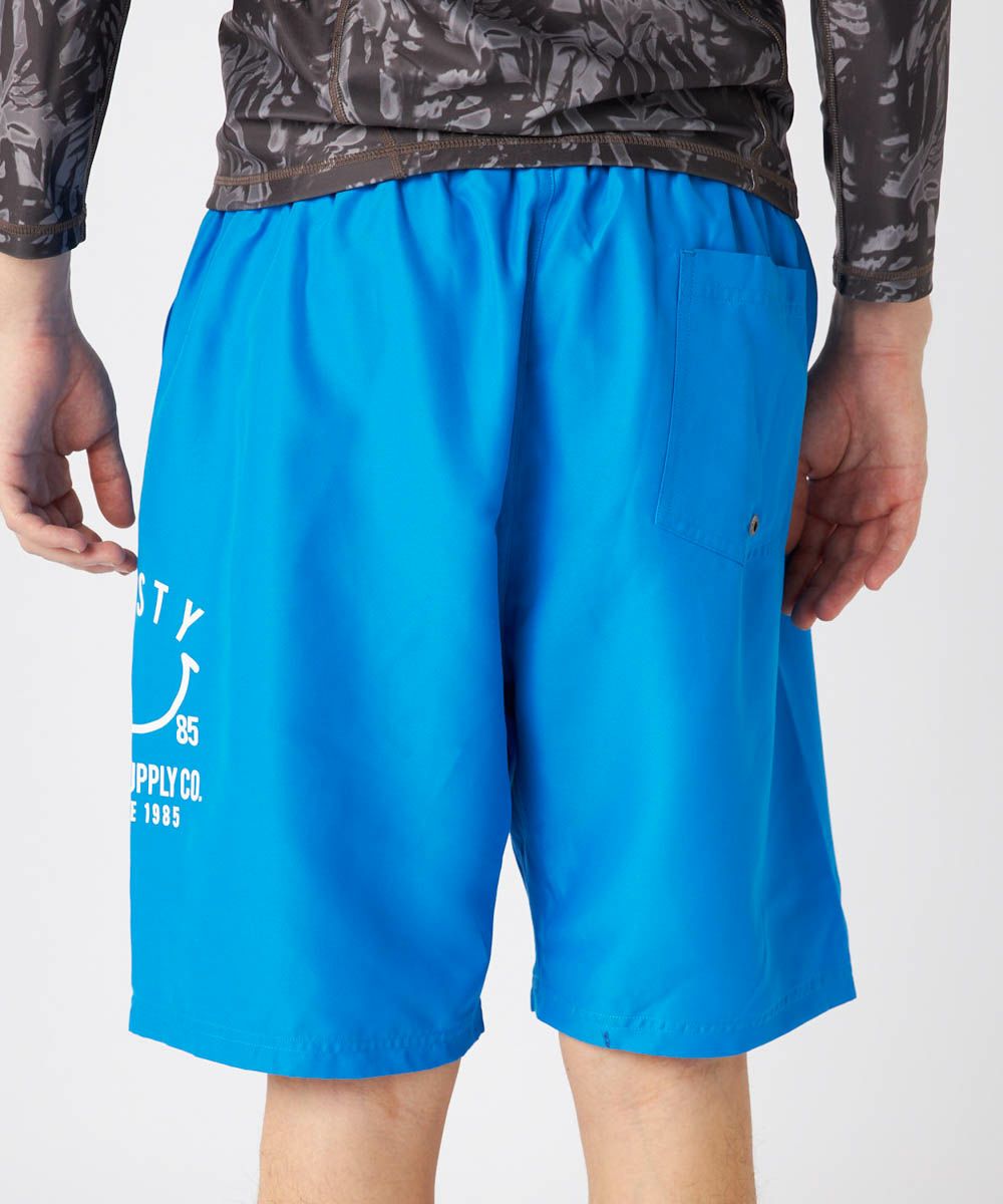 メンズボードショーツ。シンプルなデザインに定番のニコちゃんグラフィックがアクセント。 ストレッチ素材を使用しており、快適で動きやすい一枚です。両サイドにポケット付きで、後ろの片側ポケットの中にはゴムループがついておりKEYループとしてご使用いただけてとっても便利。