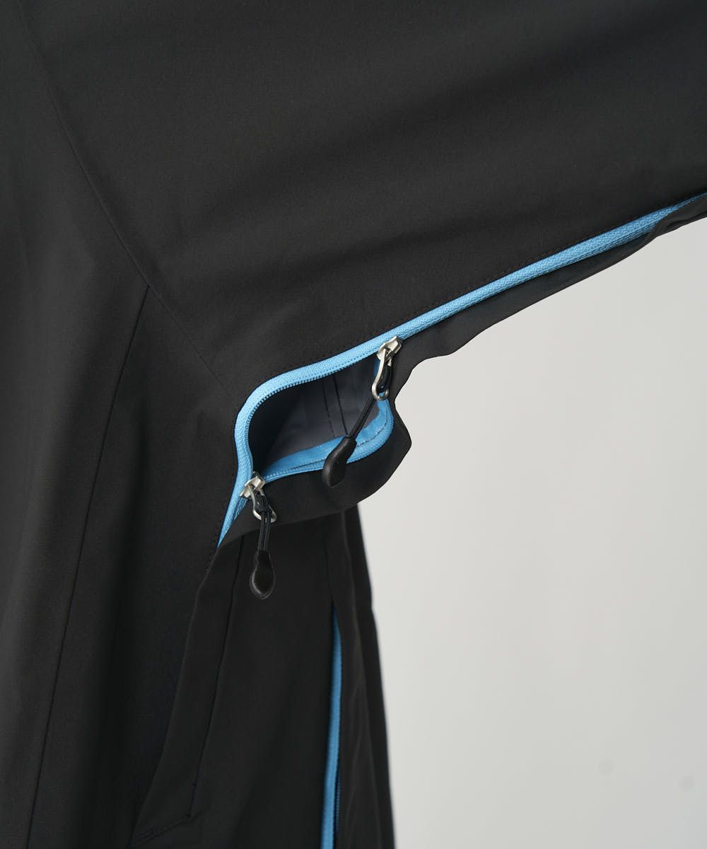 高機能ラミネート加工『SAITOS®-Z』を採用。小松マテーレが独自に開発した特殊ポリウレタンフィルムの最上級グレードに位置する高耐水圧・高透湿ラミネートファブリックです。本格的な雨の中での長時間の着用にも耐えられる耐水圧20000mm以上/透湿度10,000g以上という機能性に加え、防風性・防水性にも優れたアングラーにとって必需品の全天候型メンズジャケット。