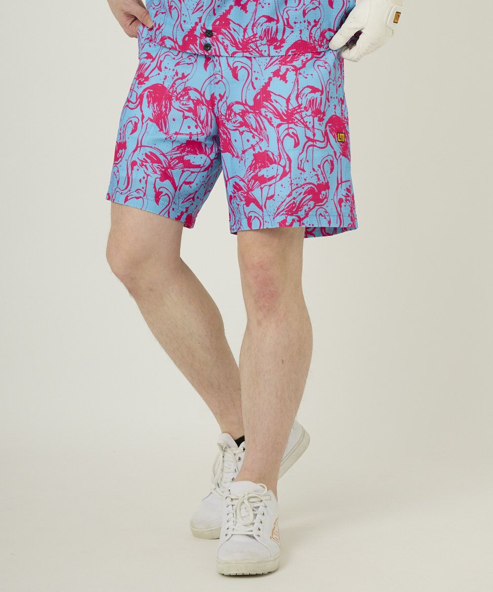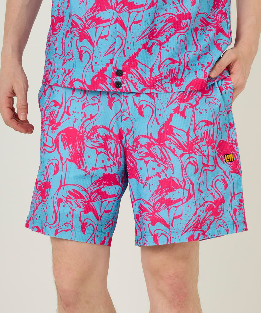 メンズ ショートパンツ ストレッチサッカー素材 フラミンゴブルーネオン UV/ストレッチ/接触冷感