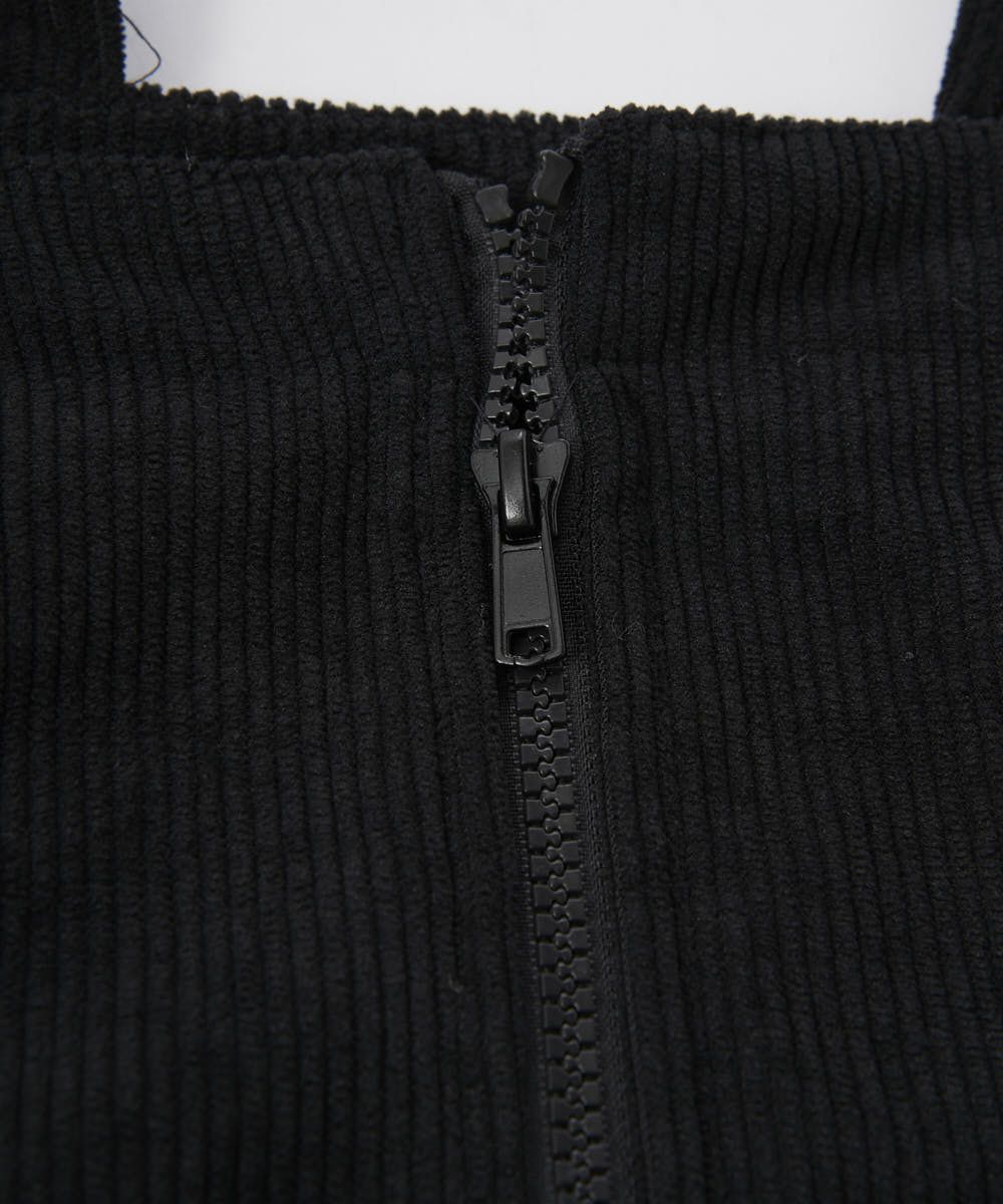 子供っぽくなりがちなジャンパースカートはモノトーンカラーで大人っぽく、コーデュロイ素材で冬仕様なデザインに仕上げています。