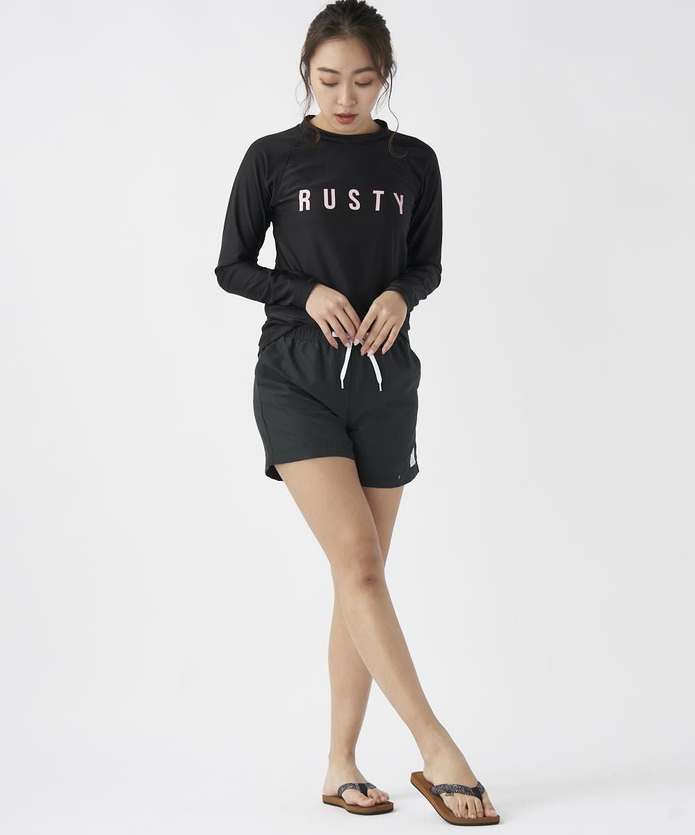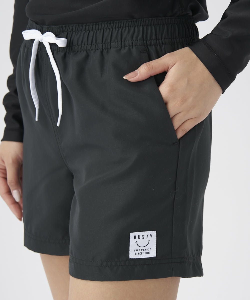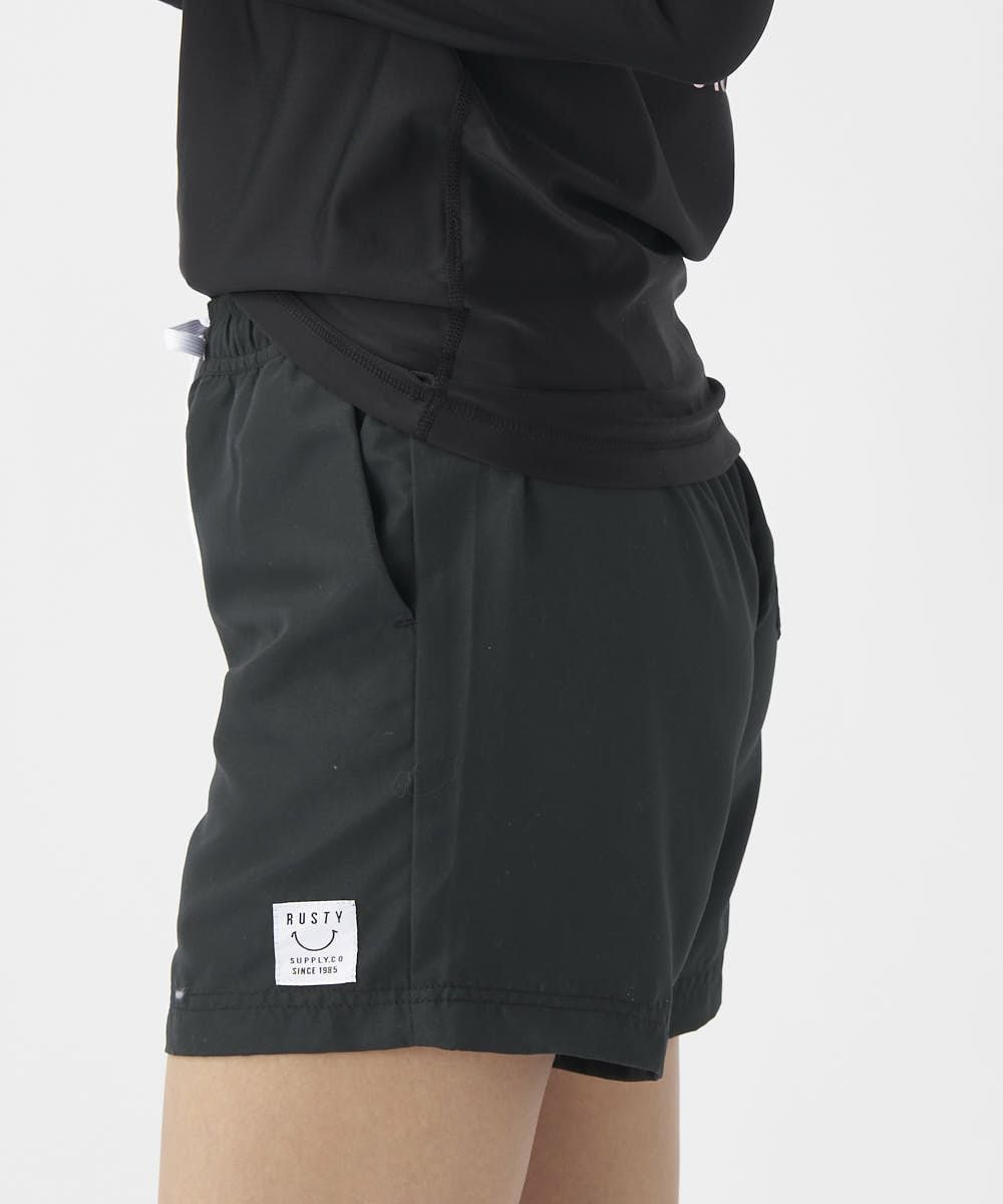 RUSTYの売れ筋ニコちゃんシリーズ。超軽量のポリエステルマイクロ素材を使用したアクティブショーツ。 左脇にはニコちゃんの織りネームを取り付けています。
