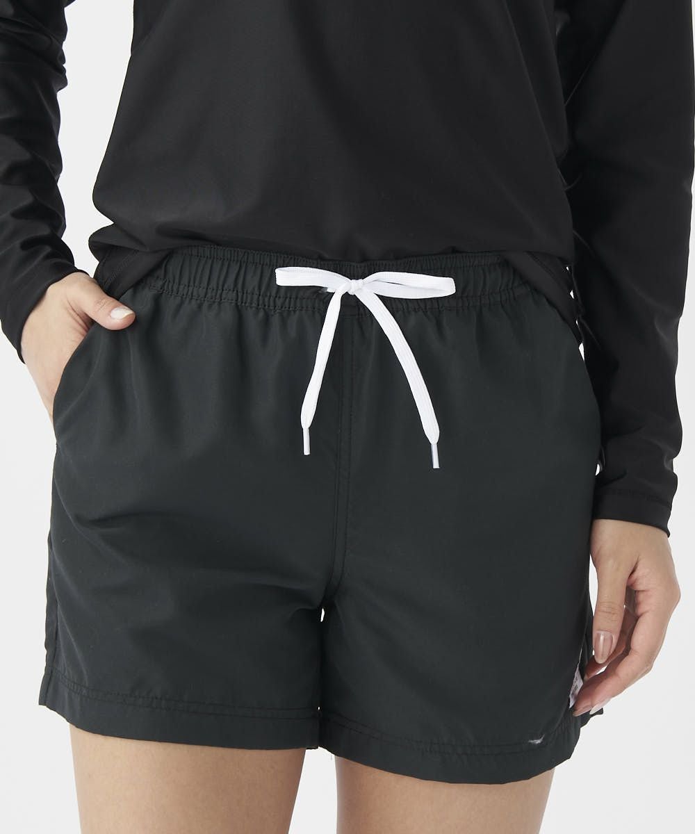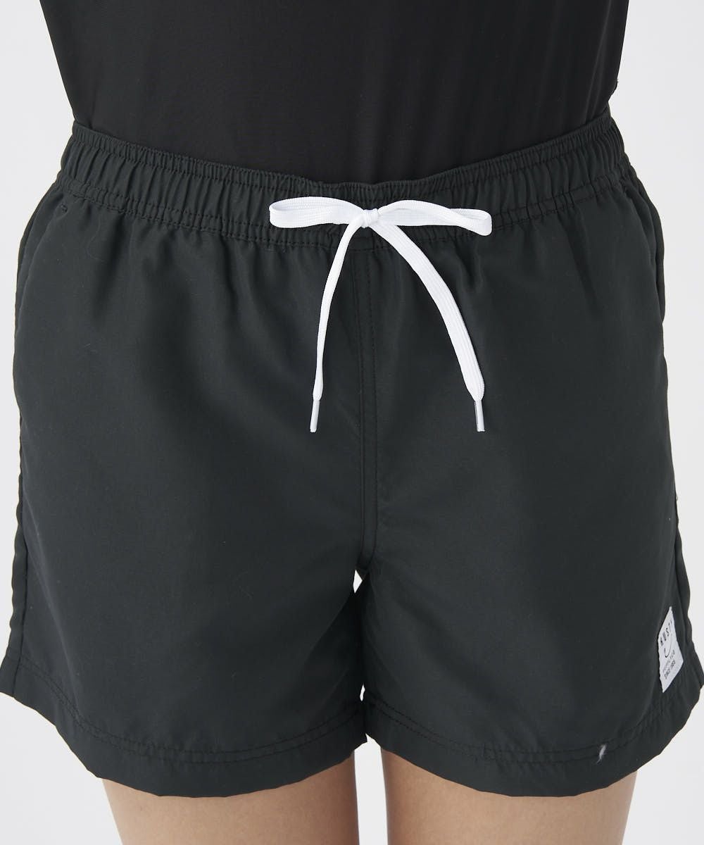 シンプルなブラックカラーで、ビーチやプール、タウンユースにも使える万能アイテムです。軽量なポリエステル素材で速乾性があり、ウエストはゴムとドローコードで調整可能。シンプルなデザインで、どんなトップスとも相性抜群。