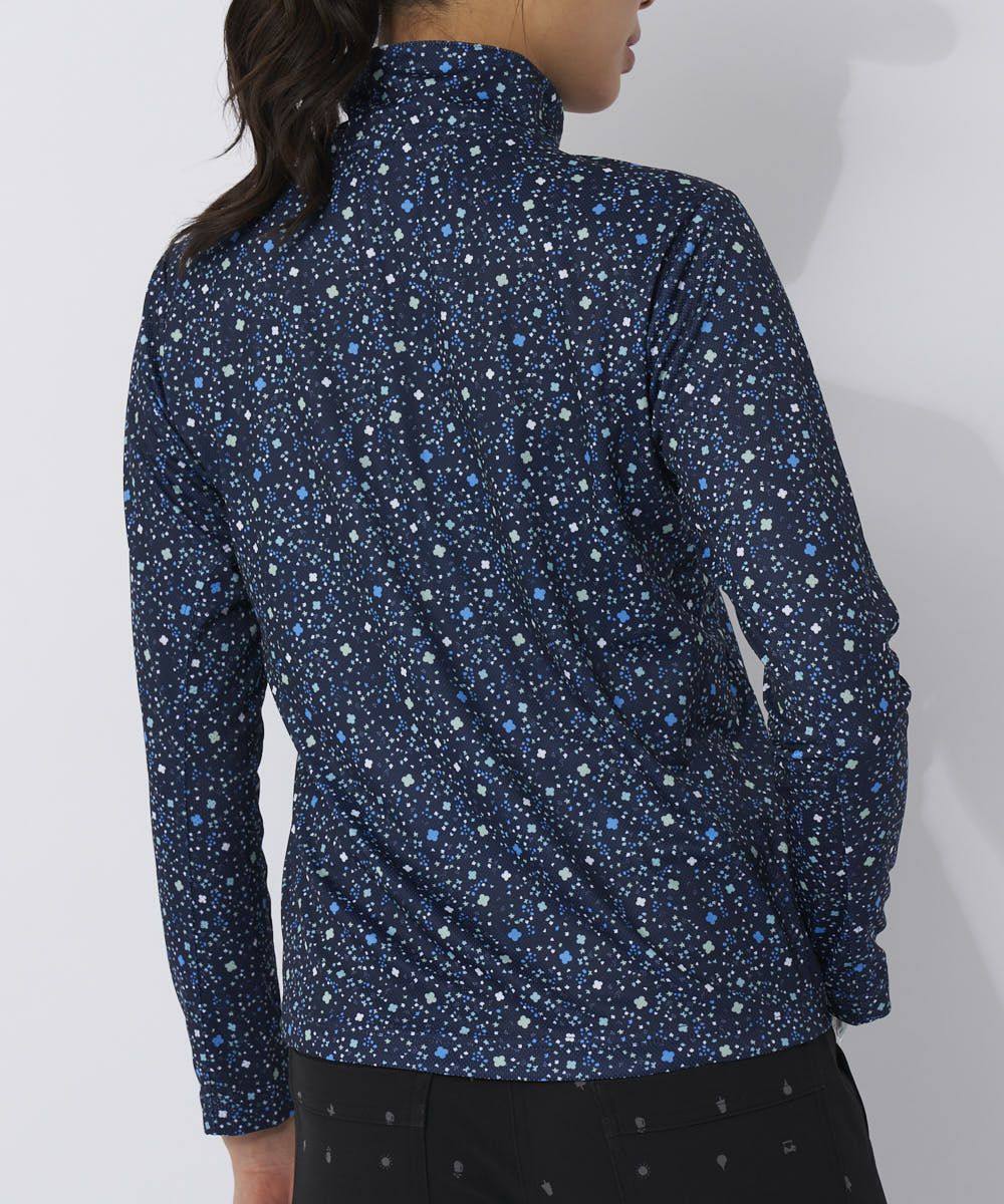 やっぱり快適さ№1のZIPUPシャツで快適プレーを♪袖下、脇に同柄のメッシュ素材を切り替え、快適さを兼ね備えています。薄くてサラっとしたポリエステル素材で高機能な素材です。スプレーしたような爽やかなお花柄がカワイイ一枚です。