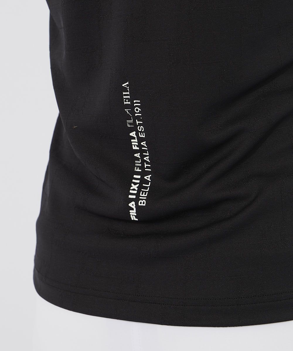 動きやすい変形ラグランスリーブシャツ。脇線を前側に寄せることで、細見せ効果を持たせました。FILAロゴをジャガードで表現したストレッチ性の良い素材を採用。