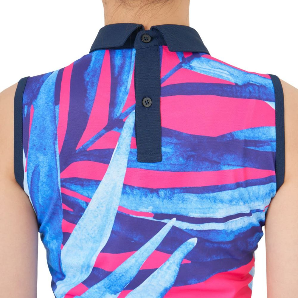 サラッとした肌触りのポリエステル素材を使用した 柄ノースリーブシャツ。ネオンカラーを打ち出しに今シーズンのインパクトのある柄を展開。