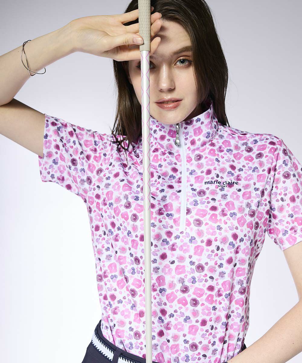 レディース 花柄半袖ハイネックシャツ|吸汗速乾/ストレッチ/UVカット/接触冷感