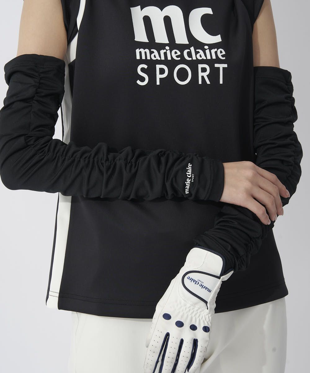 シャーリング アームカバー。袖底をメッシュ素材に切替え、吸汗速乾素材でサラッとした着用感。シャーリン グのくしゅくしゅ感が女性らしく、長時間の着用でも圧迫感が無く快適です。