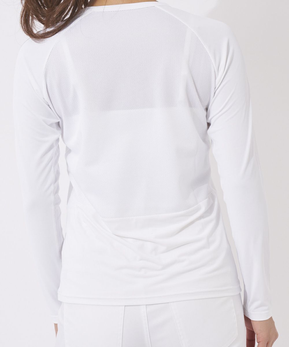 接触冷感機能糸を使用した、ベア天竺のUネックインナーシャツ。袖下、背中のメッシュ素材は皮膚接着面積が少ないため汗をかいてもべたつかず、蒸れを軽減する仕様となっております。