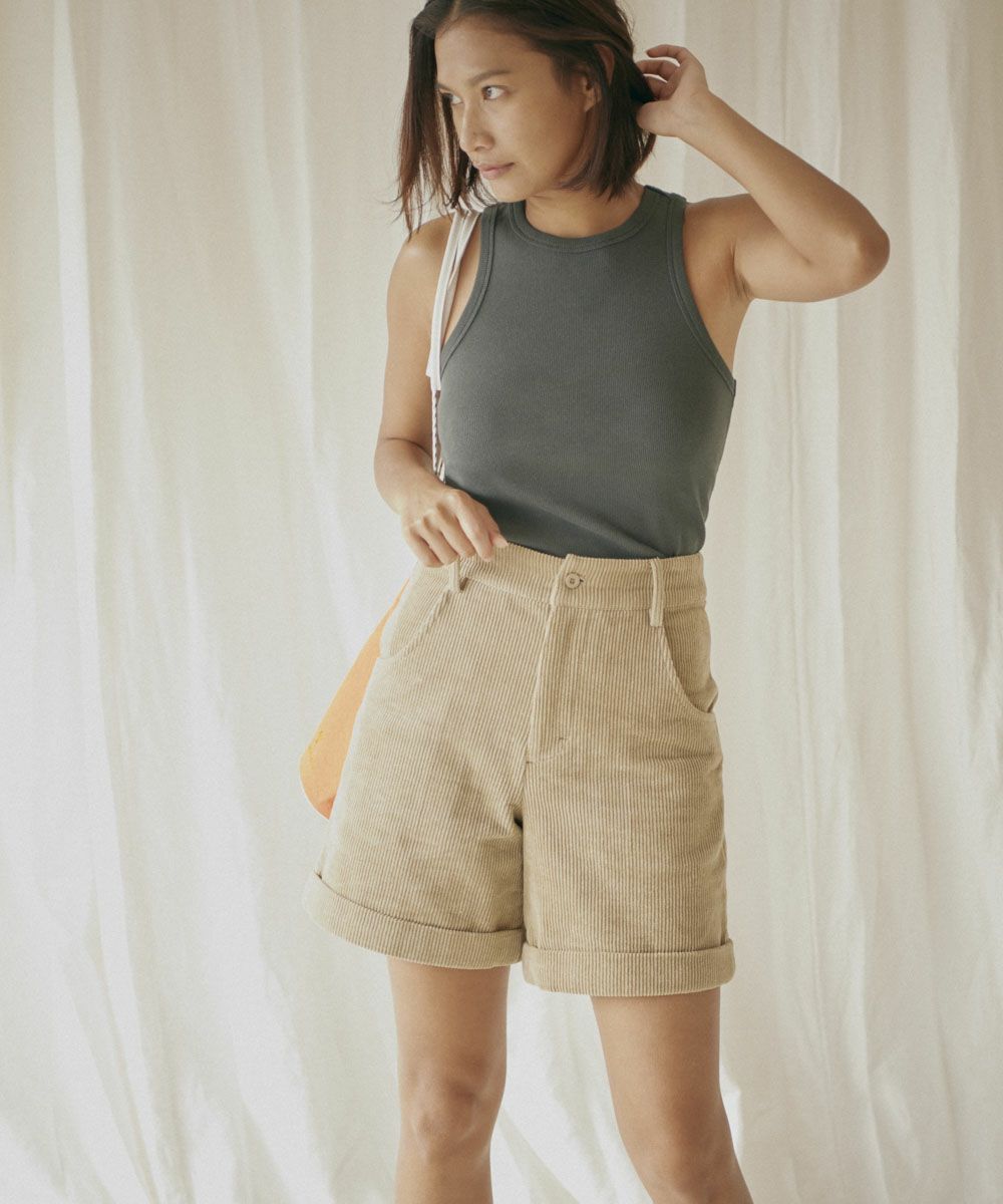 定番のコーデュロイショーツより長めの丈感で街でも履きやすいデザイン。