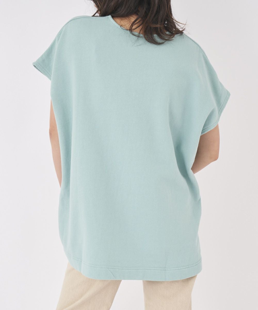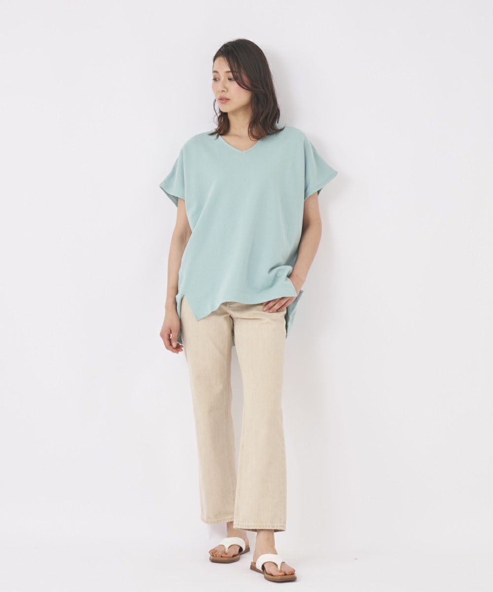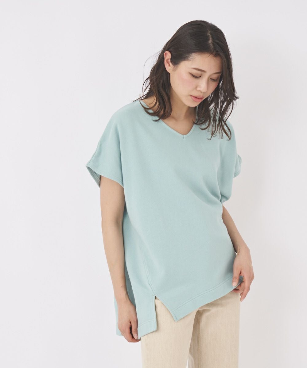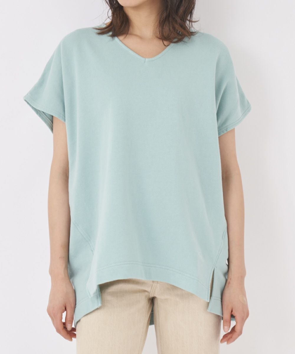 綿素材で着心地のいい半袖トレーナー。ゆったりしたシルエットで、気になるパーツを隠してくれます。インに合わせるアイテムを変えて楽しむのも◎