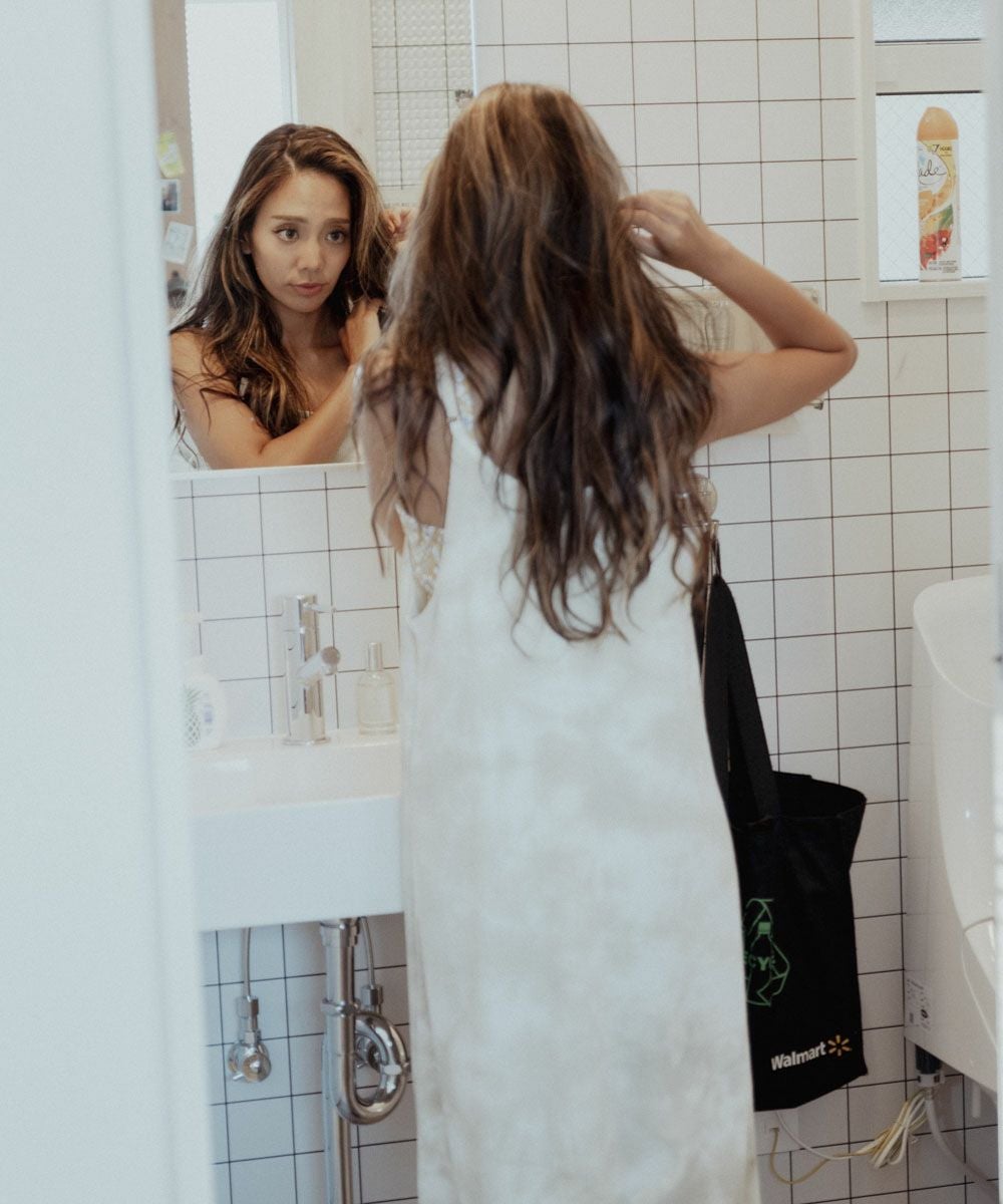 肩紐で長さ調整可能。水にも入れるハイブリッドワッフルなので、普段着でも水回りのレジャーでも様々なシーンで着て頂けます。