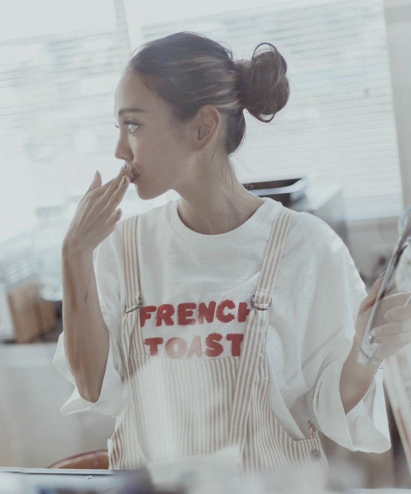サーファーガールの好きな食べ物を立体的な相良刺繍で表現。スラブ生地の風合いと刺繍の立体感が可愛い!
