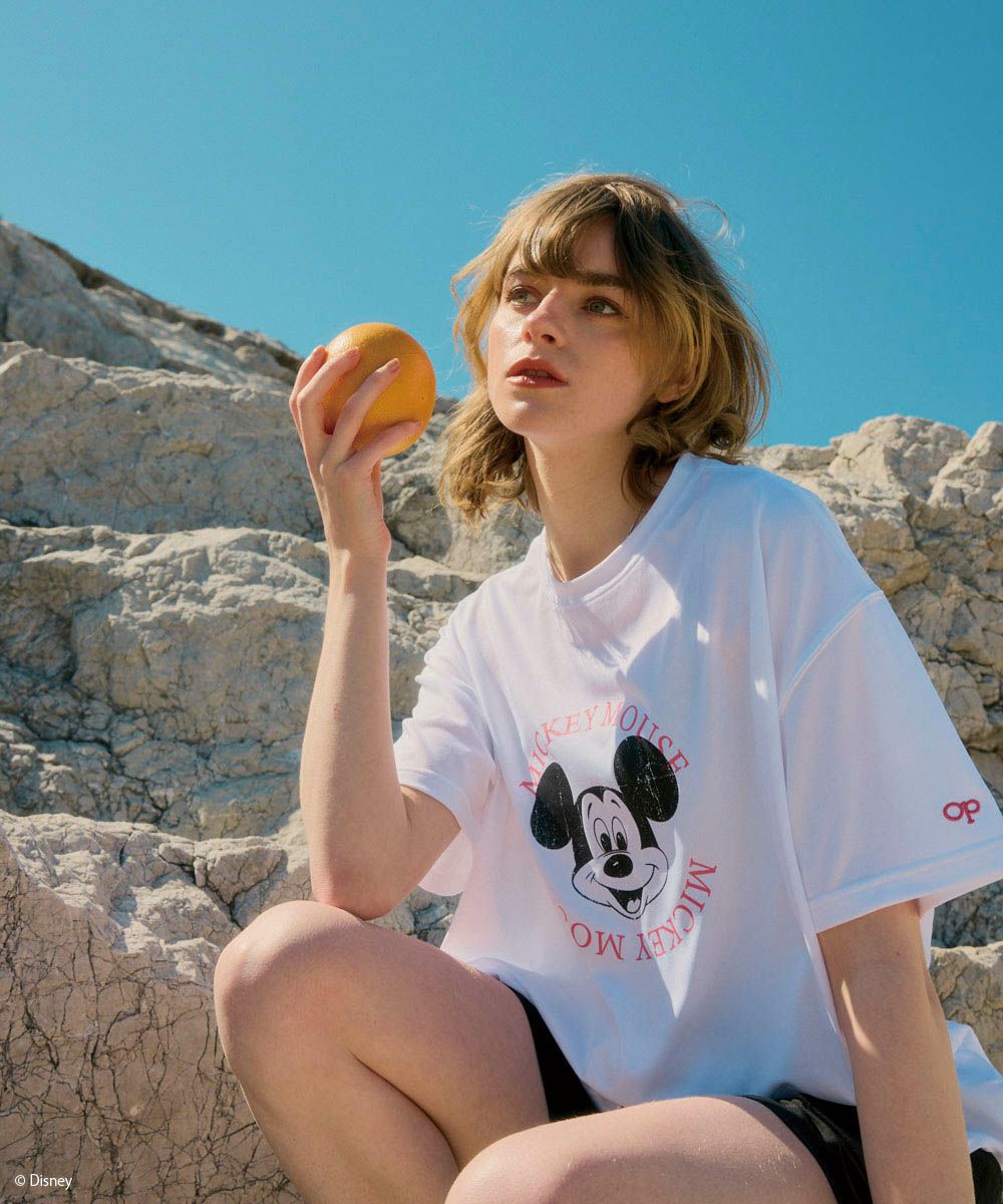レトロなミッキーマウスのフェイスプリントとサークルロゴがかわいい、着るだけでハッピーになれる1枚。