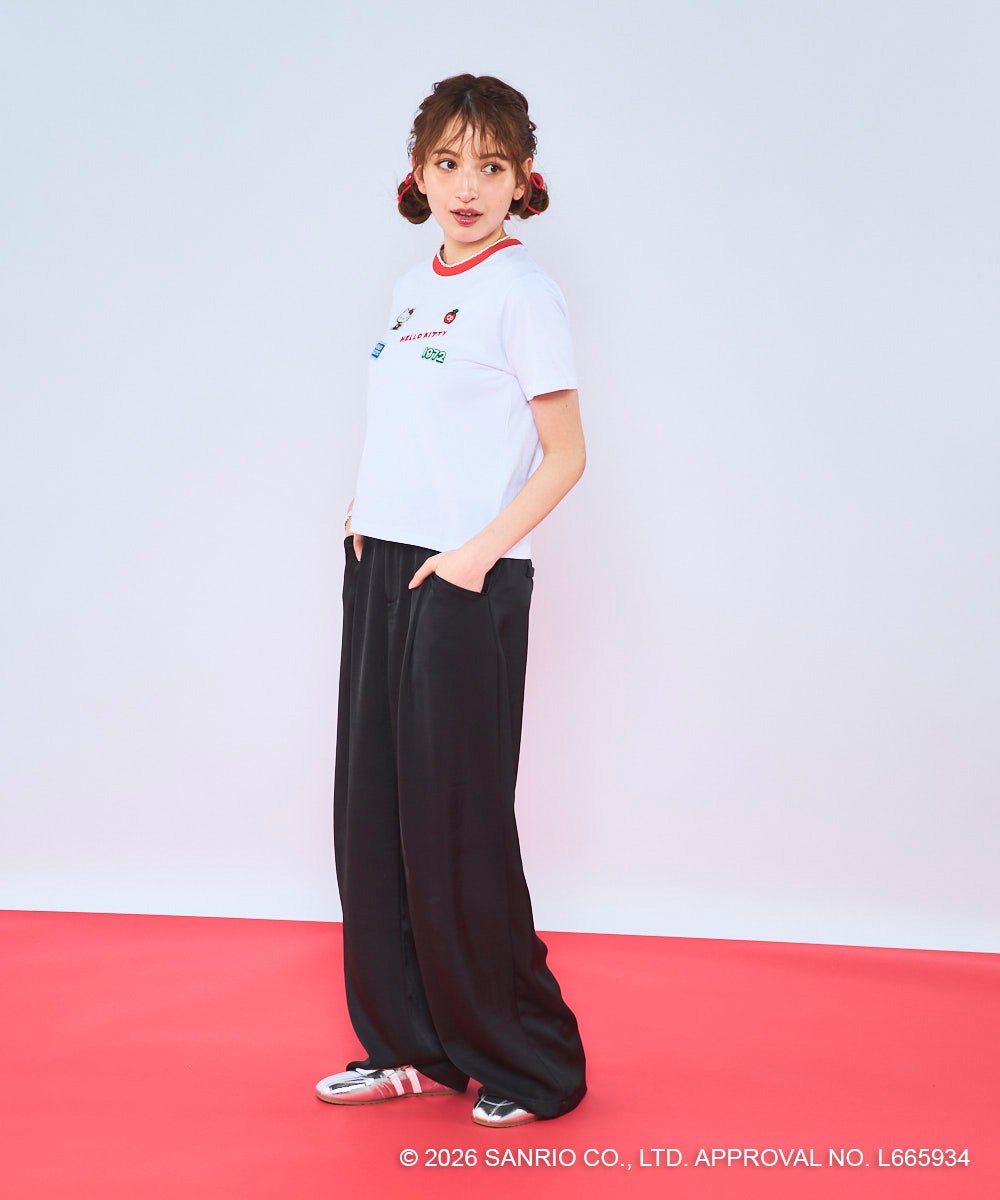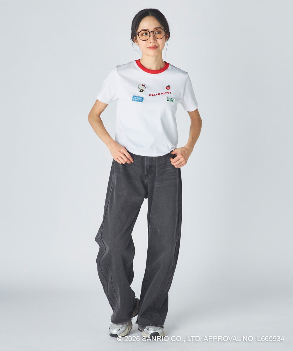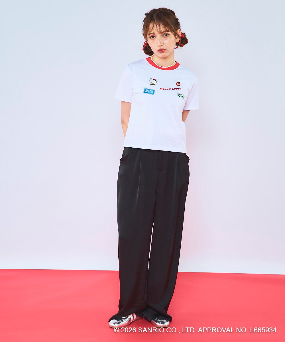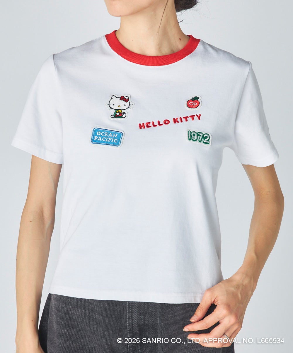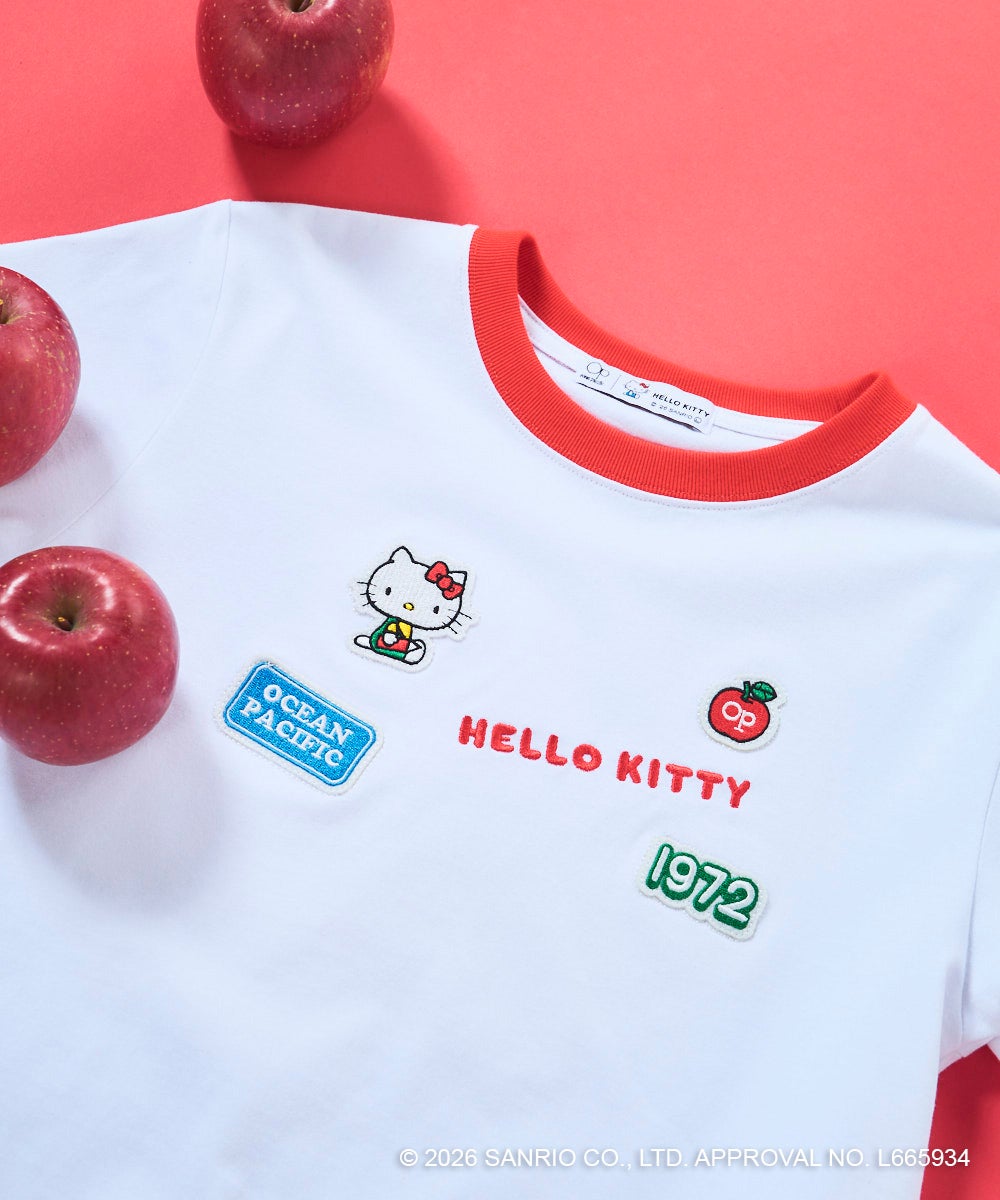 胸元に立体感のあるワッペンとロゴ刺しゅうをあしらった、レトロかわいいコラボTシャツ。「HELLO KITTY」のロゴや“1972”のナンバリング、Ocean Pacificのネームタグ風ワッペンなど、遊び心のあるモチーフをちりばめました。