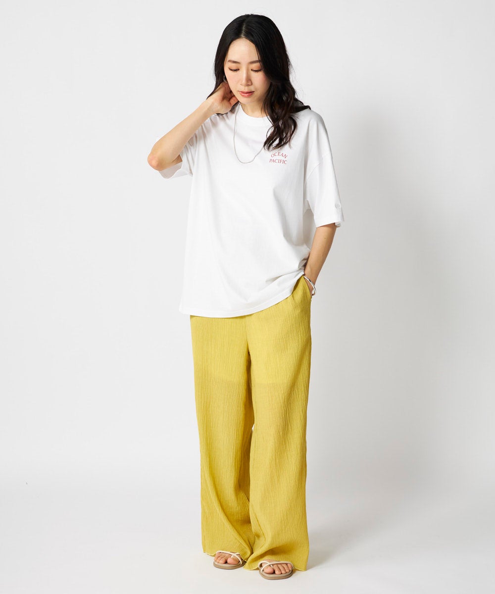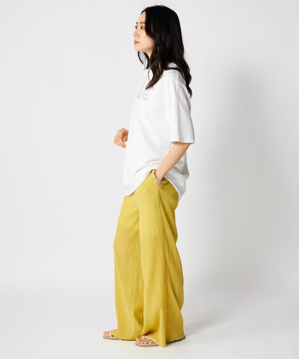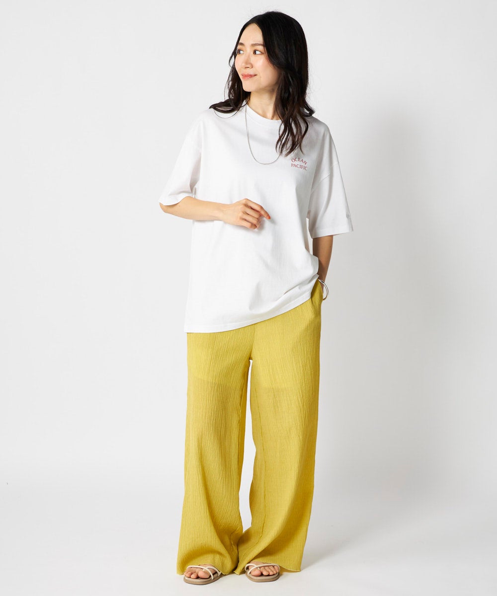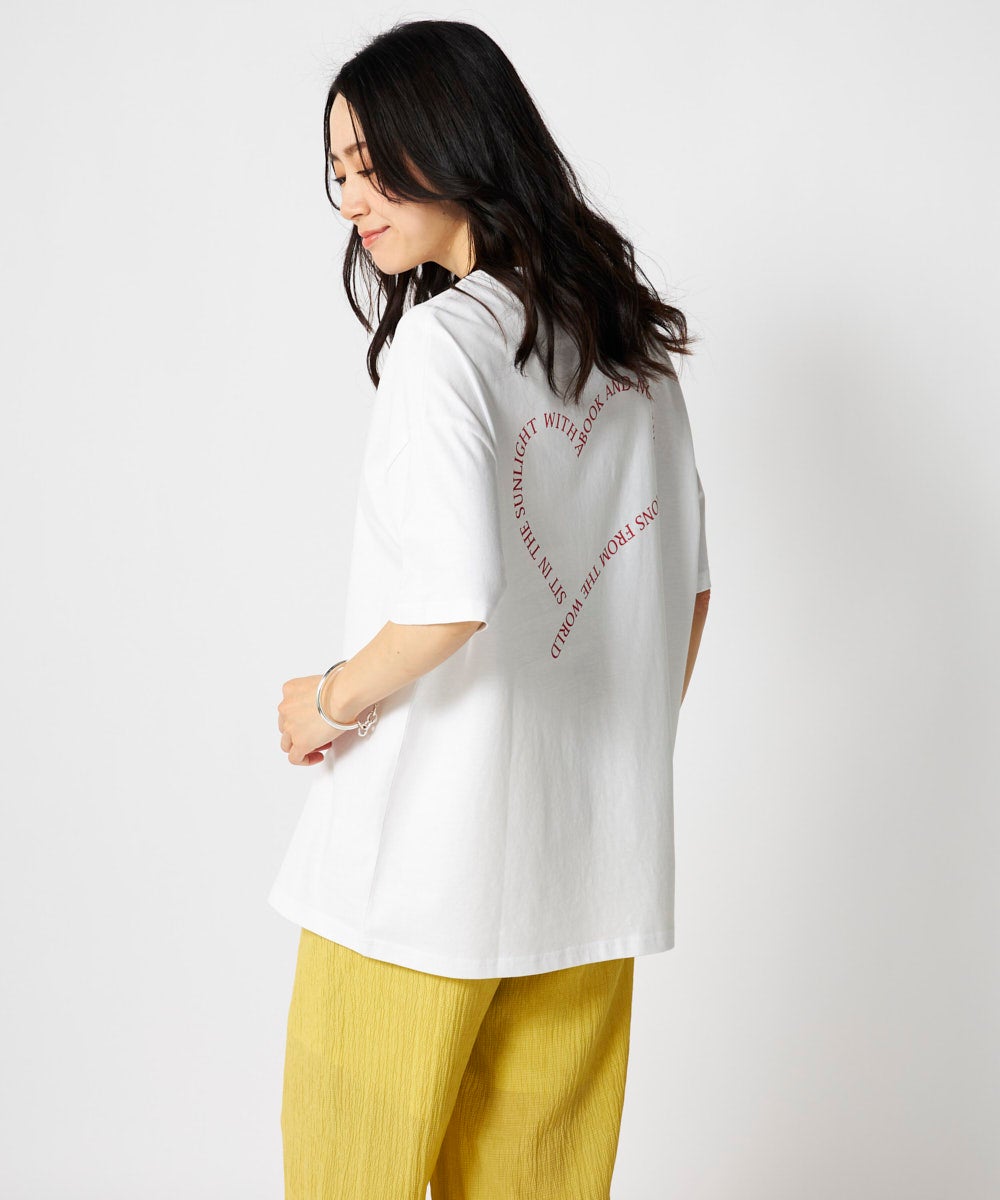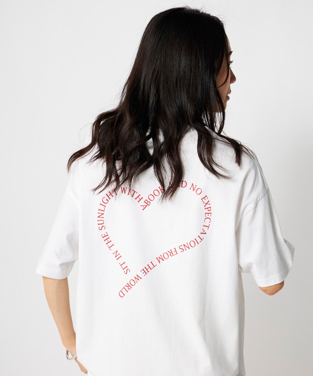 遊び心のある「ハートシェイプ・タイポグラフィ」一見するとシンプルなハートのバックプリントですが、一文 のメッセージで形作られています。グラフィックとして可愛くなりすぎず、知的な遊び心を感じさせる「大人な ハート」のデザインです。洗練されたワントーンのプリントカラーが上品で女性らしさとクリーンな印象を同時 に引き立てています。「SIT IN THE SUNLIGHT WITH A BOOK..(太陽の下で 本を読み、世界に何も期待せず過ごす)」というフレーズが、スローライフで心地よい世界観を表現しました。