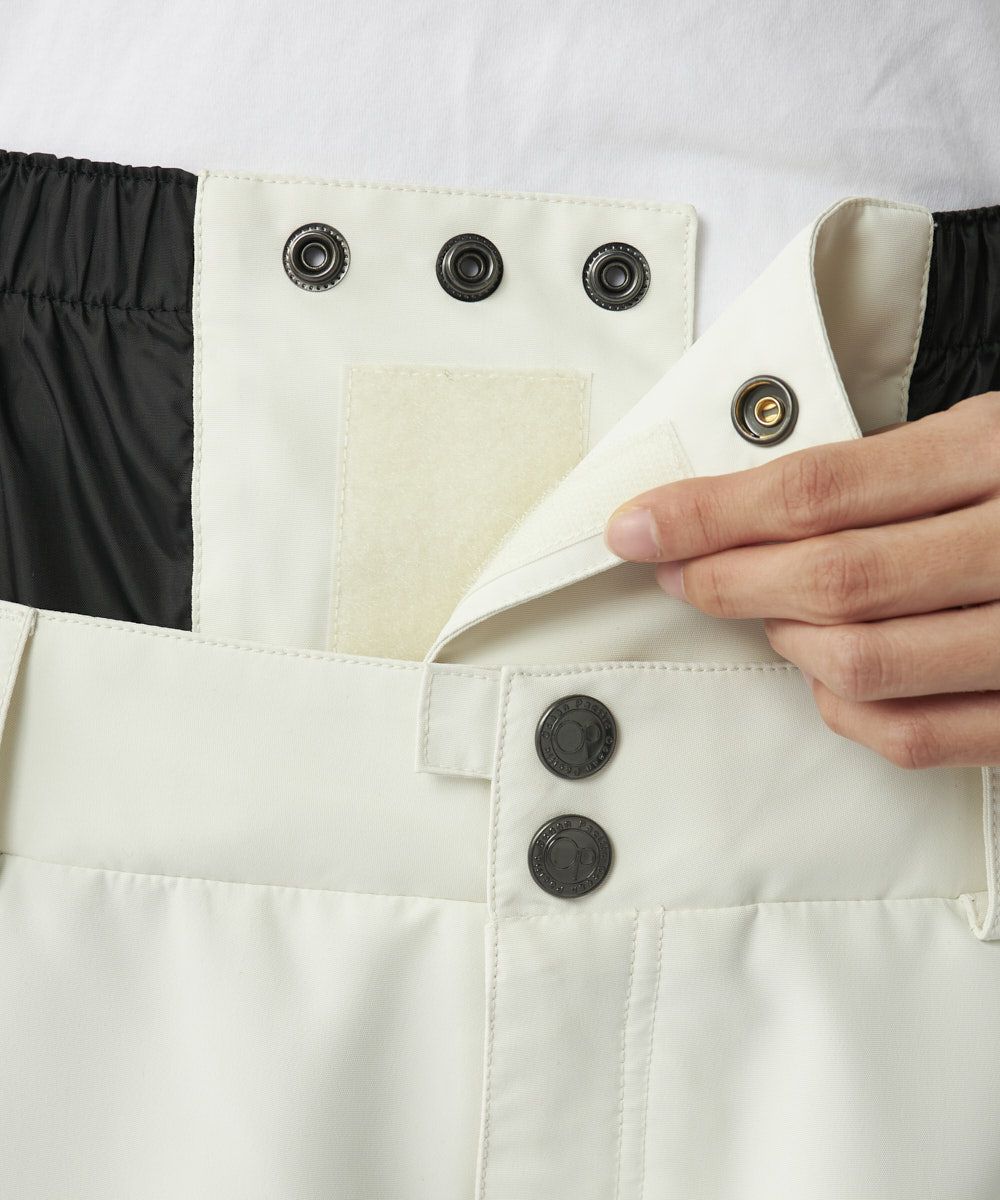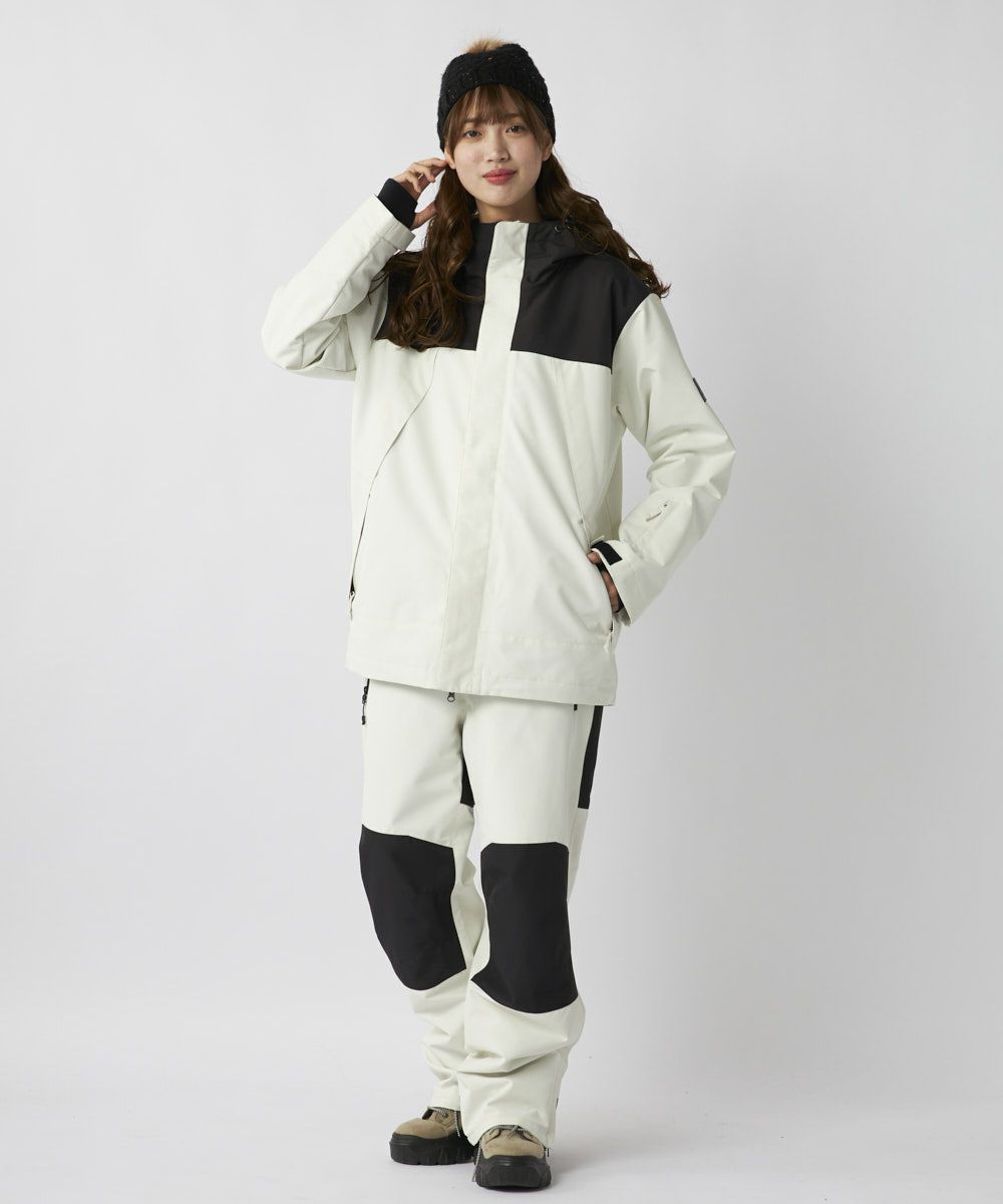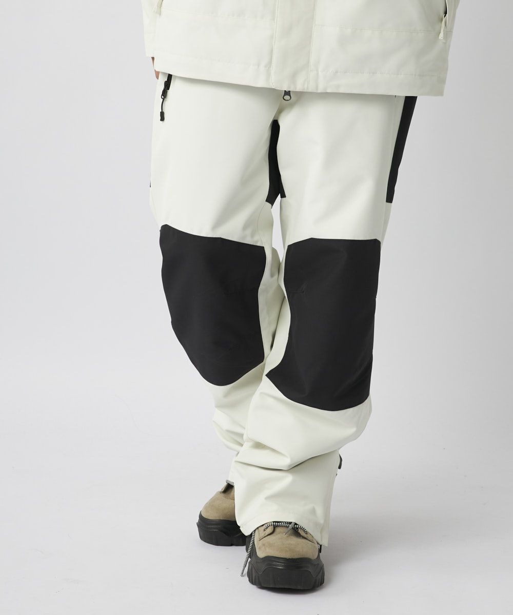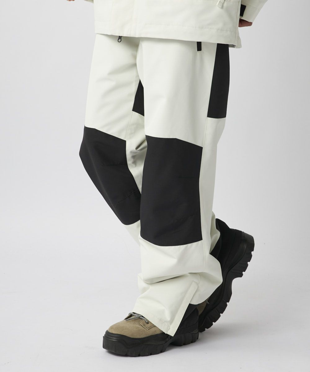 程よいワイドシルエットで、ニュアンスカラーのベースと膝、お尻、裾後ろを黒で切り替えしたシンプルなデザインです。同じカラーのジャケットを合わせてセットアップがお勧めです。