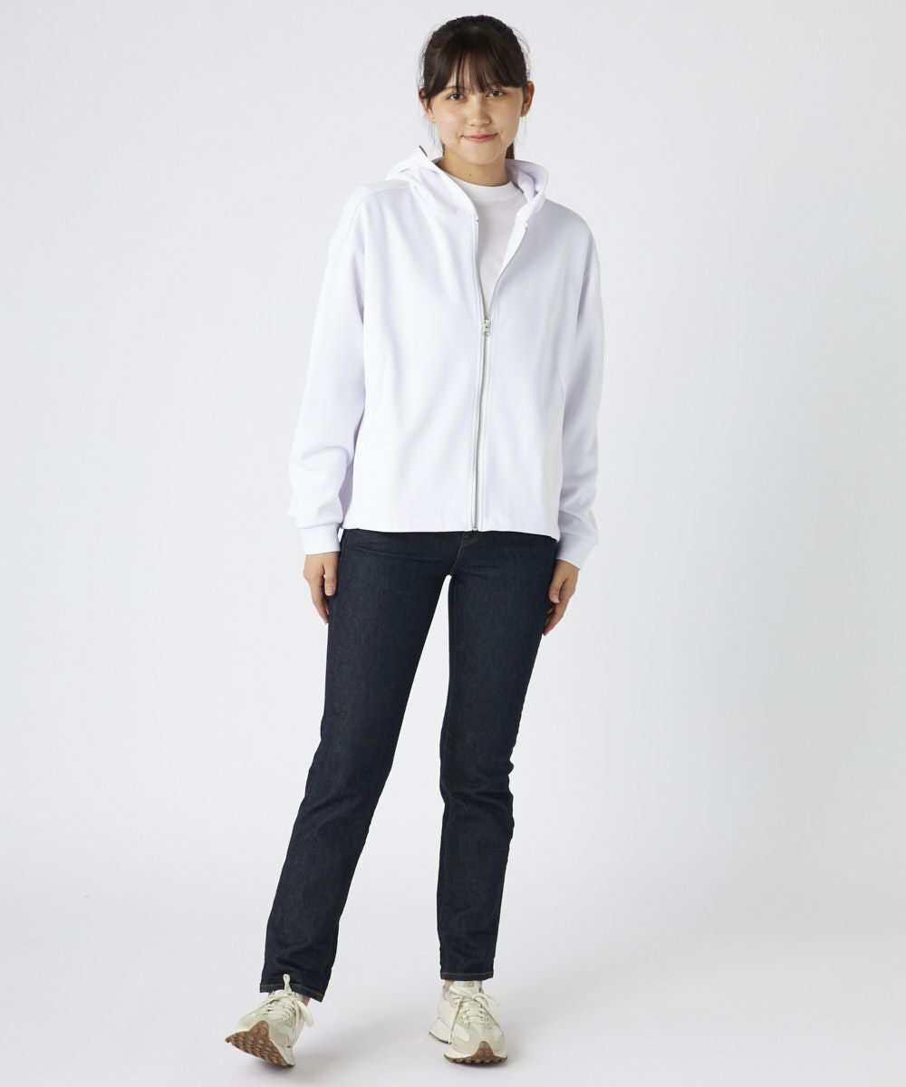 軽量で保温性があり、UVカット付き、伸縮性があり、シワになりにくくお家でのお手入れも簡単。立体感×軽やかさが魅力!ふくらみ感のあるダンボールニットを使用した、裾ドローコード付きのジップアップパーカー。ダンボールニット素材は軽くてハリがあり、なめらかな表面感が特徴で保温性も兼ね備えております。また、シワになりにくく、美シルエットをキープ。裾のドローコードでシルエット自在!