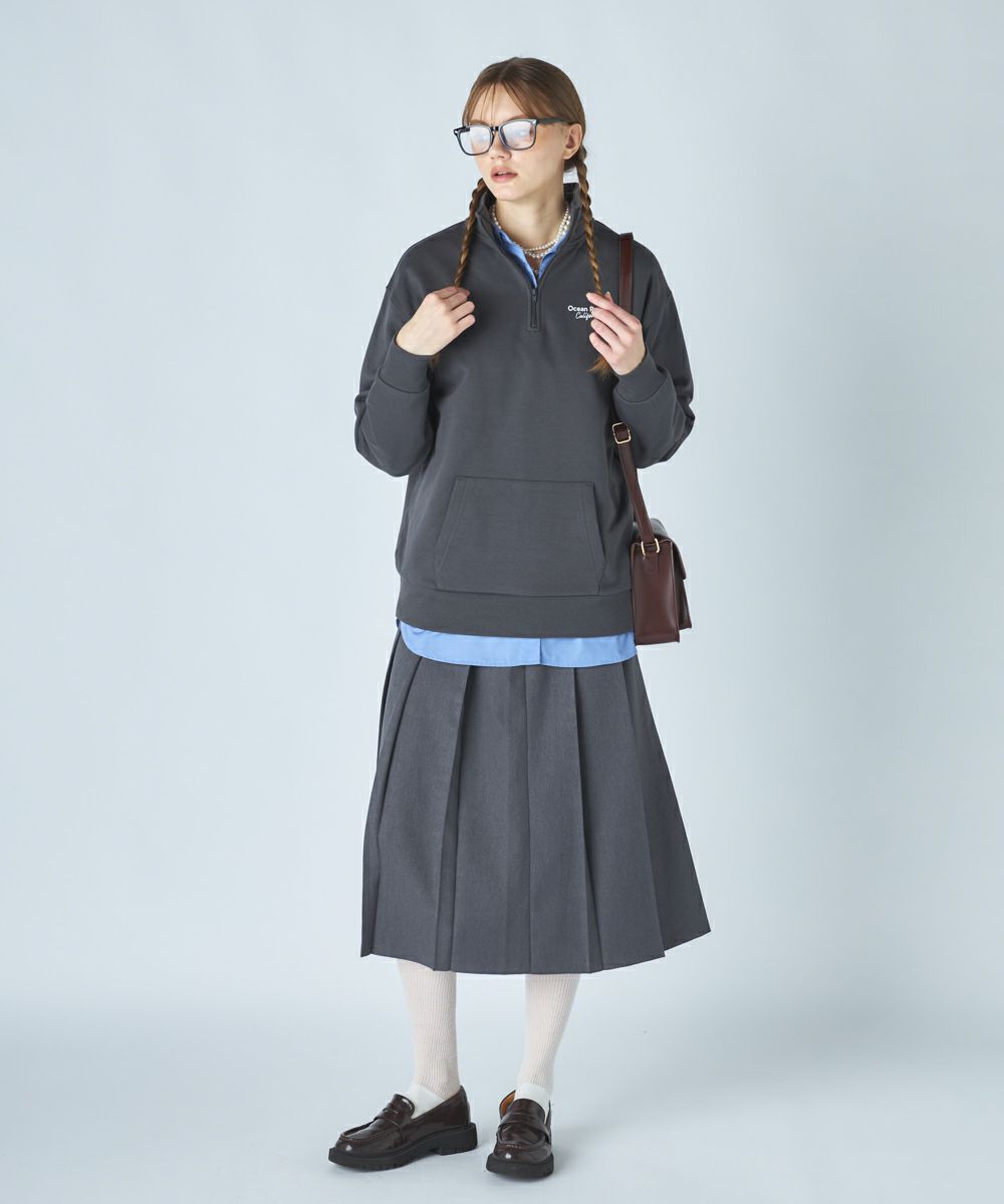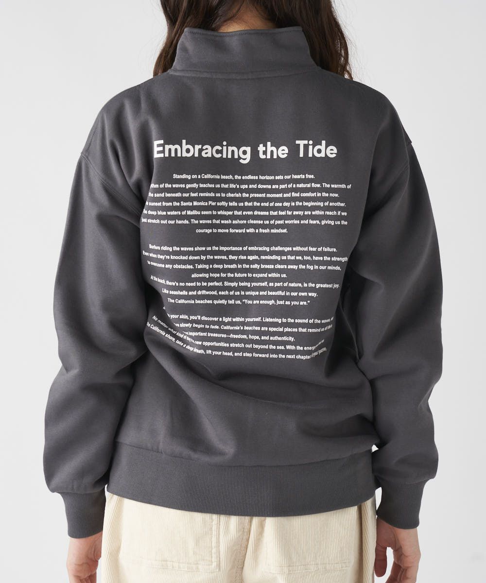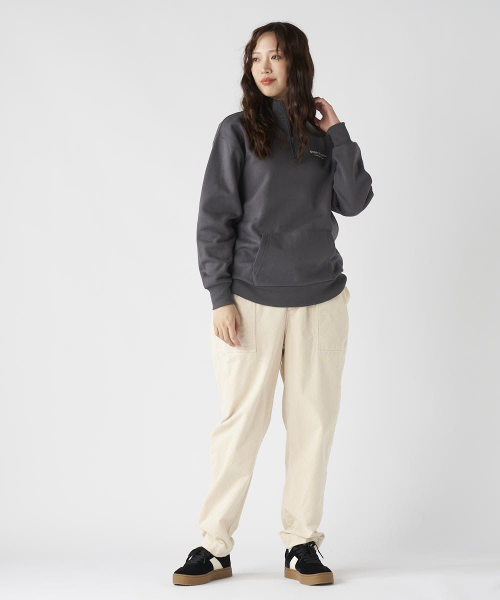 柔らかくふんわり裏起毛で保温性◎軽量でもしっかり暖かく、ゆったりシルエットでストレスフリーな着心地。トレンド感と快適さを両立した、秋冬に大活躍間違いなしのアイテムとなっています。胸元のブランドロゴと、背中に大胆に施された英文メッセージが目を引くスウェット。カジュアルストリートなイメージで、ハーフジップ仕様なので、気温やスタイリングに合わせて襟元の表情を変えられるのが魅力です。