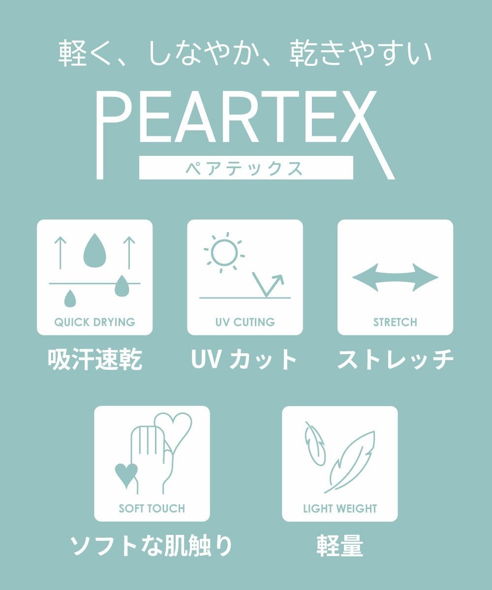ポリエステル100%のバネ状の糸が、生地にストレッチ性をもたらし自由度に優れたウェアを生み出します。 またポリウレタンを使用していないため、経年劣化の抑制、超軽量化を実現しました。 表面撥水機能とUVカット機能付きです。