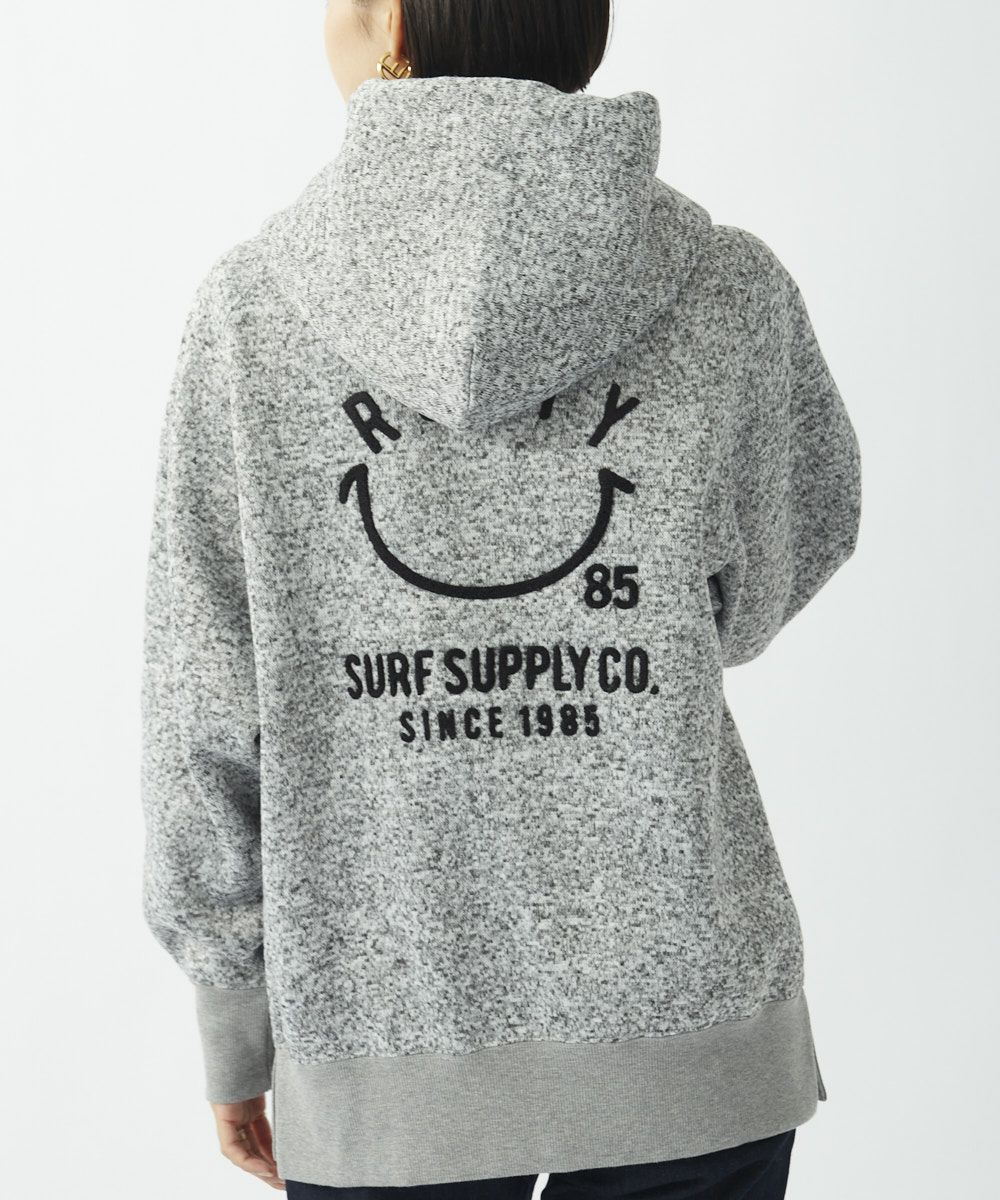 サガラ刺繍入りで人気のスマイル柄をニットフリース素材のプルパーカーに落とし込んだアイテム。注目度抜群の売れ筋商品。