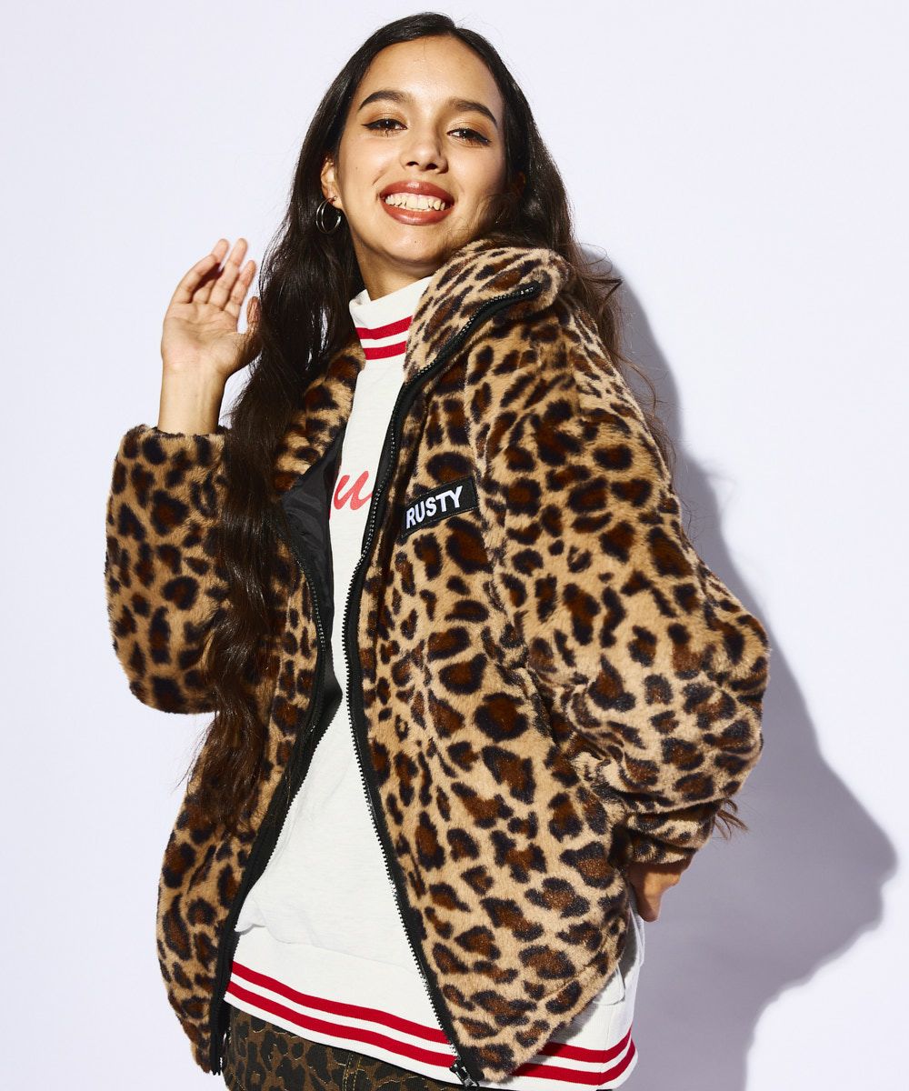 ふわふわの柔らかい肌触りの柄ボアフリース素材を使用。ドローコードが付いているので裾を絞って着ることも可能です!RUSTYらしいかっこいい柄がコーデのアクセントになること間違いなし◎