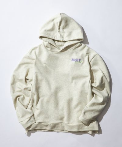 RUSTYレディース裏毛スウェットパーカ。胸のサガラ刺繍と袖の“STAY”“SUNNY”プリントがスタイリッシュ。ややワイドな快適シルエット。セットアップも可能