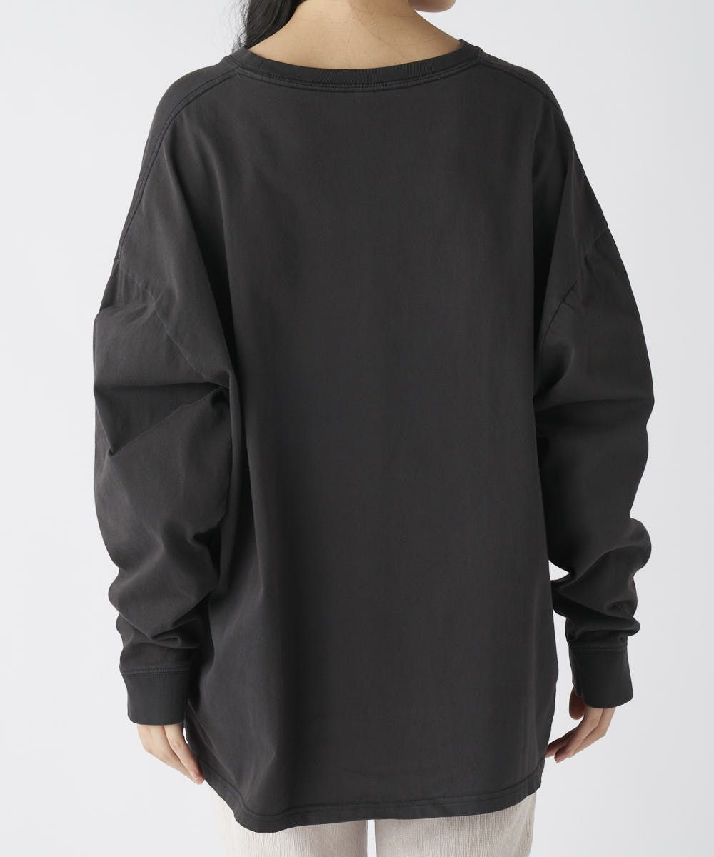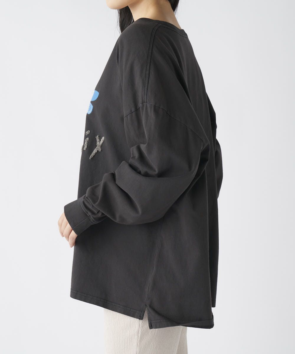ゆるっと着られるカジュアルなロンTに、ちょっとした遊び心をプラス。フロントに大きめのお花プリント、その中心にはさりげないニコちゃんマーク。着るだけでちょっと楽しくなる、そんな1枚です。