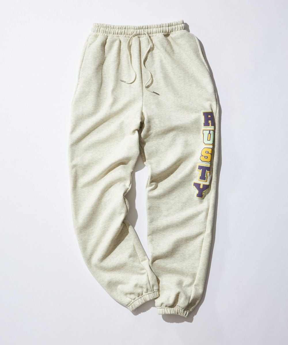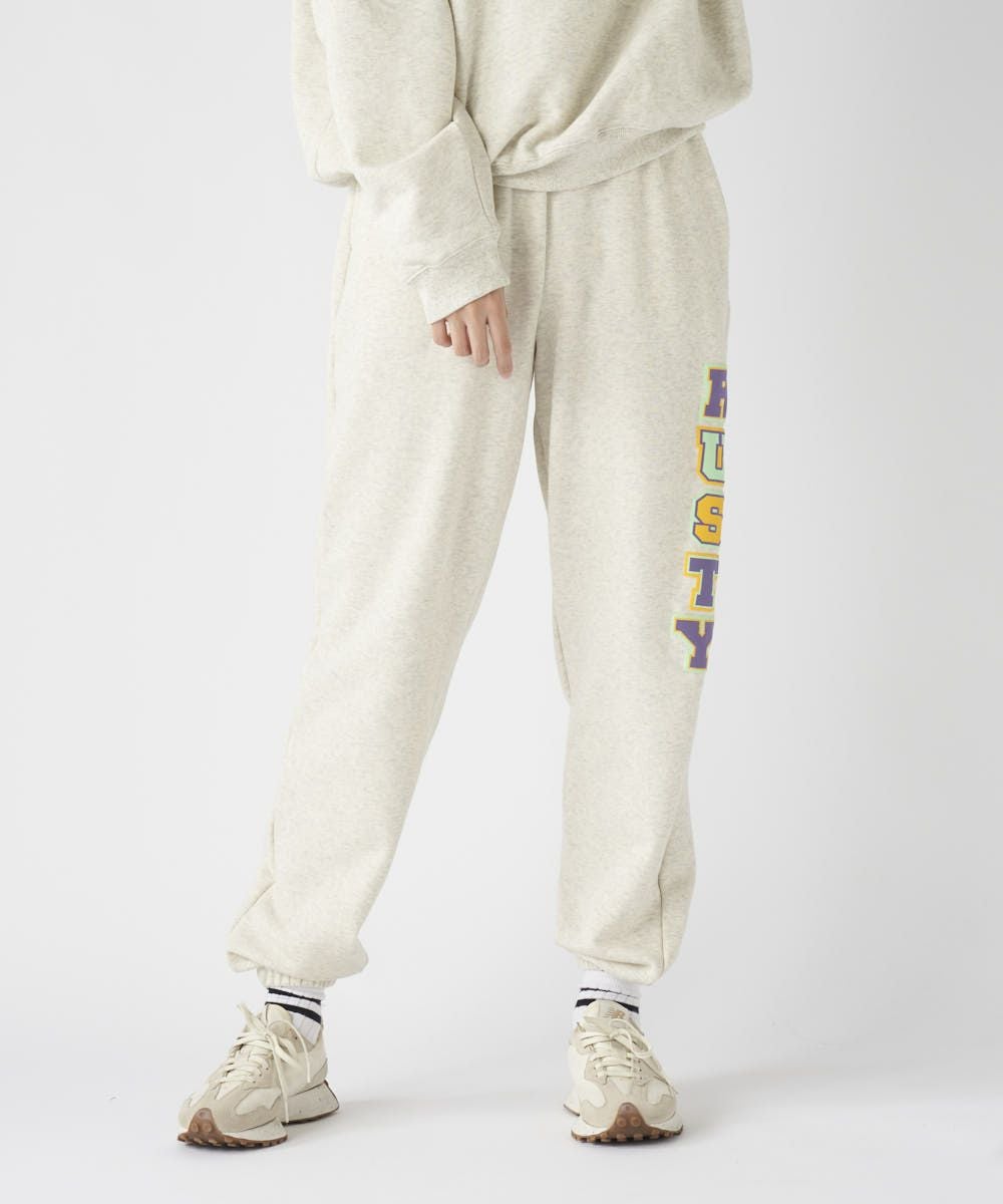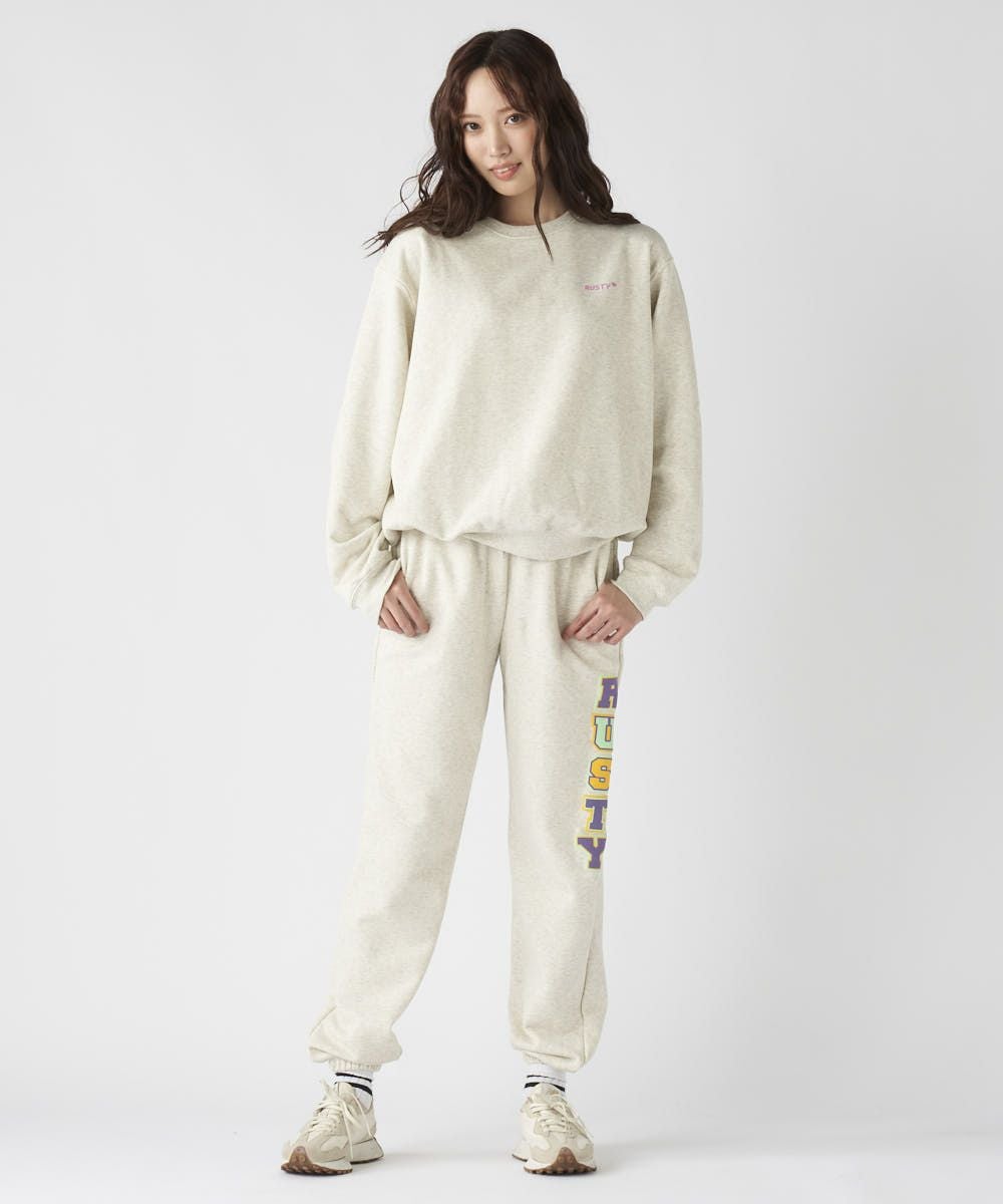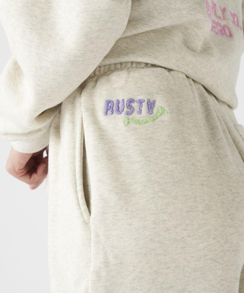 RUSTYレディース裏毛スウェットパンツ。ウエスト下のサガラ刺繍と脚部の発泡プリントがアクセント。セットアップも可能な快適アイテム。