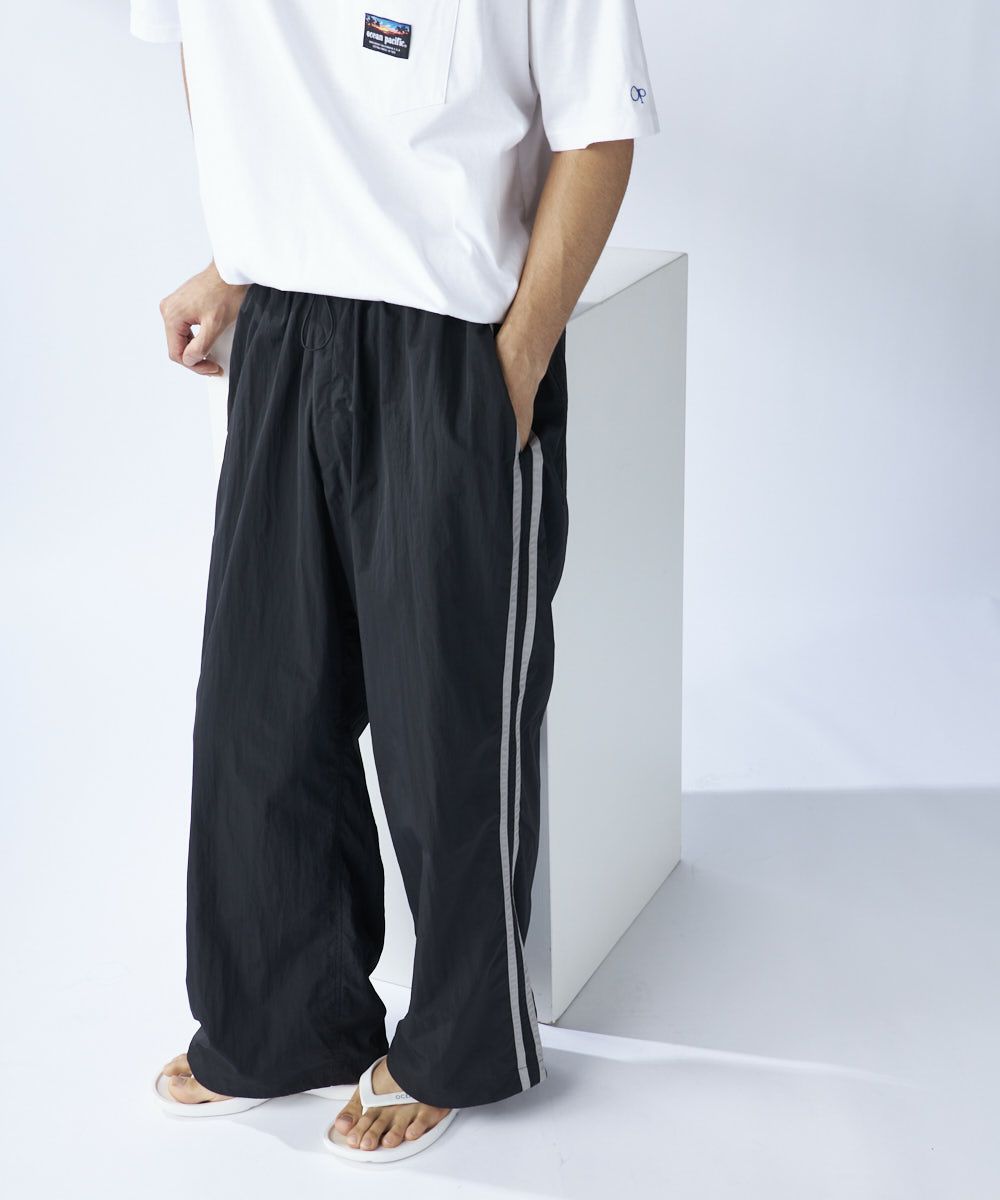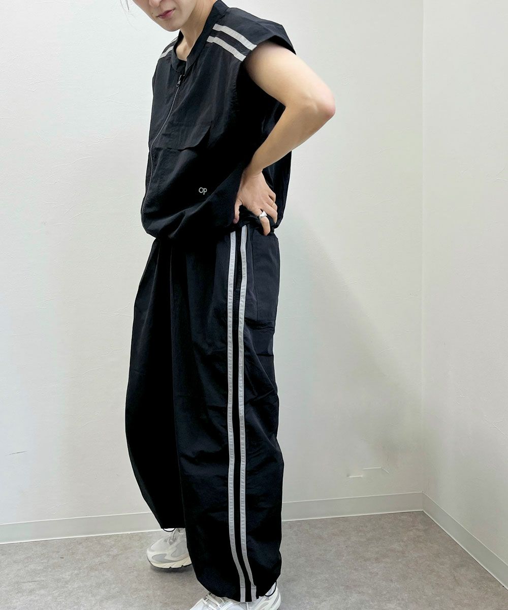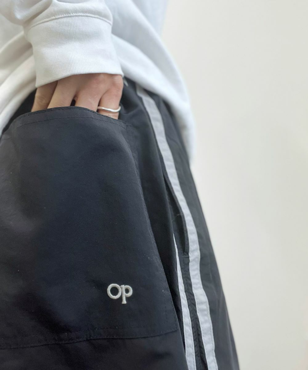 配色のラインとポケットのOPロゴ刺繍がかわいいトラックパンツ。