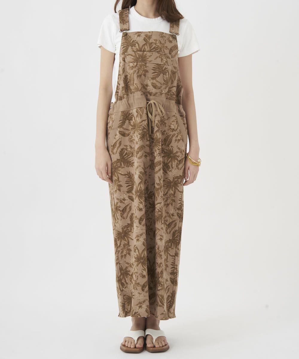 ボタニカル柄のジャンパースカート。ワンマイルにもぴったり。ウエストが調整できるので、妊婦の方にもおすすめ。