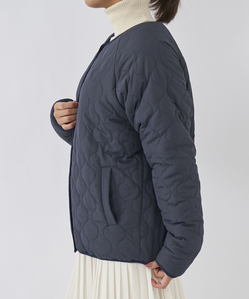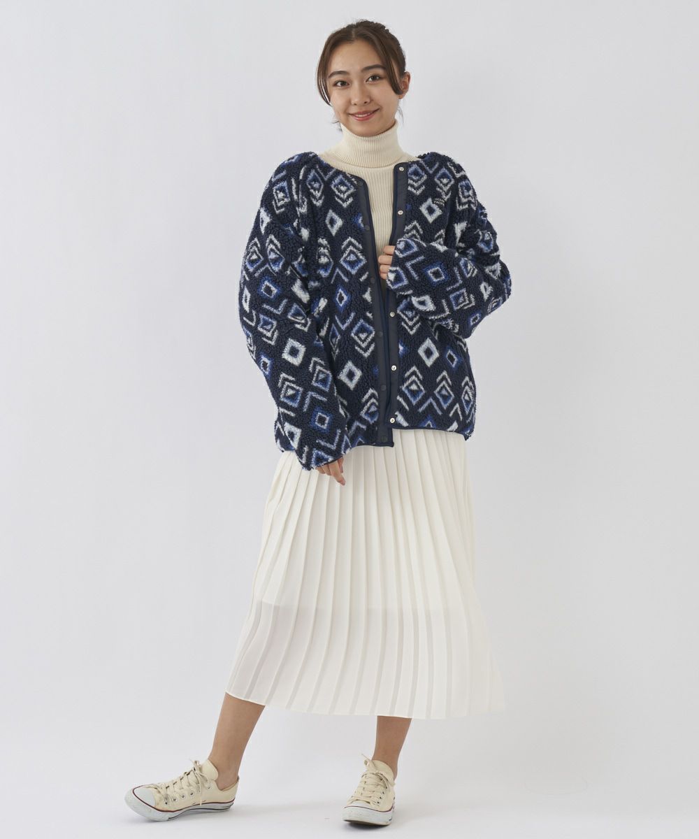 今季オリジナルのネイティブ柄を柔らかなボアにプリントした面と、軽やかなポリエステル素材に瓢箪柄のキルティングされた面と リバーシブルで使えるあったかノーカラージャケットブルゾンです。